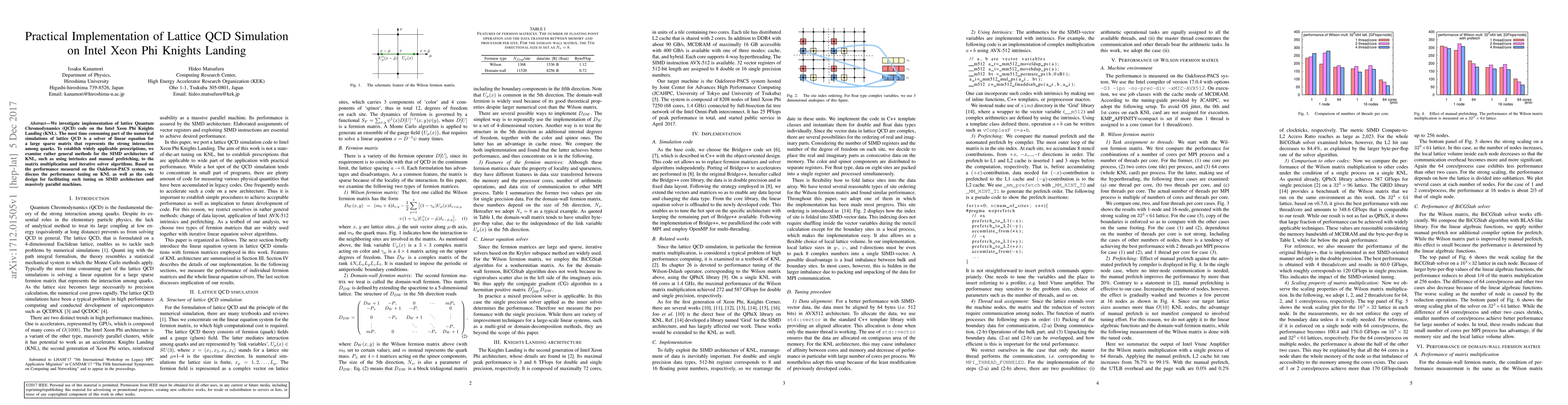 This paper explores the implementation of lattice QCD simulations on Intel Xeon Phi Knights Landing, focusing on optimizing the solver for large sparse matrices. It examines various methods, including intrinsics and manual prefetching, for matrix multiplication and iterative solvers, and discusses performance tuning and code design for SIMD architecture and parallel computing.