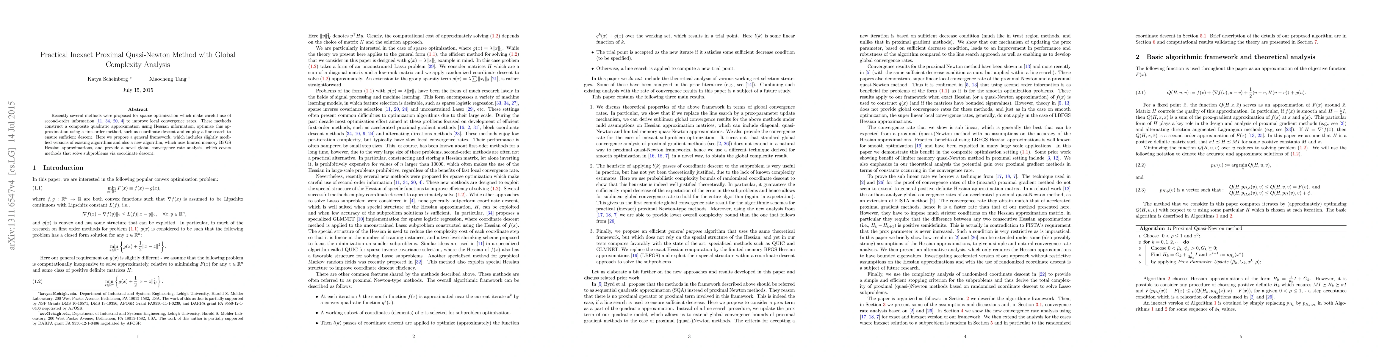 Recently several methods were proposed for sparse optimization which make careful use of second-order information [10, 28, 16, 3] to improve local convergence rates. These methods construct a composite quadratic approximation using Hessian information, optimize this approximation using a first-order method, such as coordinate descent and employ a line search to ensure sufficient descent. Here we propose a general framework, which includes slightly modified versions of existing algorithms and also a new algorithm, which uses limited memory BFGS Hessian approximations, and provide a novel global convergence rate analysis, which covers methods that solve subproblems via coordinate descent.
