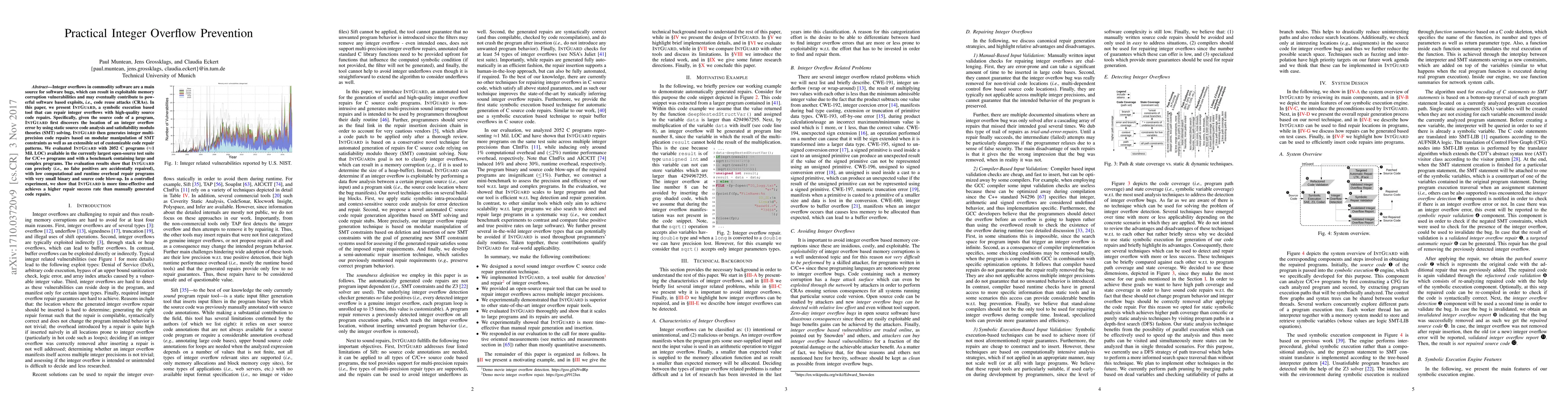 Integer overflows in commodity software are a main source for software bugs, which can result in exploitable memory corruption vulnerabilities and may eventually contribute to powerful software based exploits, i.e., code reuse attacks (CRAs). In this paper, we present IntGuard , a tool that can repair integer overflows with high-quality source code repairs. Specifically, given the source code of a program, IntGuard first discovers the location of an integer overflow error by using static source code analysis and satisfiability modulo theories (SMT) solving. IntGuard then generates integer multi-precision code repairs based on modular manipulation of SMT constraints as well as an extensible set of customizable code repair patterns. We have implemented and evaluated IntGuard with 2052 C programs (approx. 1 Mil. LOC) available in the currently largest open- source test suite for C/C++ programs and with a benchmark containing large and complex programs. The evaluation results show that IntGuard can precisely (i.e., no false positives are accidentally repaired), with low computational and runtime overhead repair programs with very small binary and source code blow-up. In a controlled experiment, we show that IntGuard is more time-effective and achieves a higher repair success rate than manually generated code repairs.