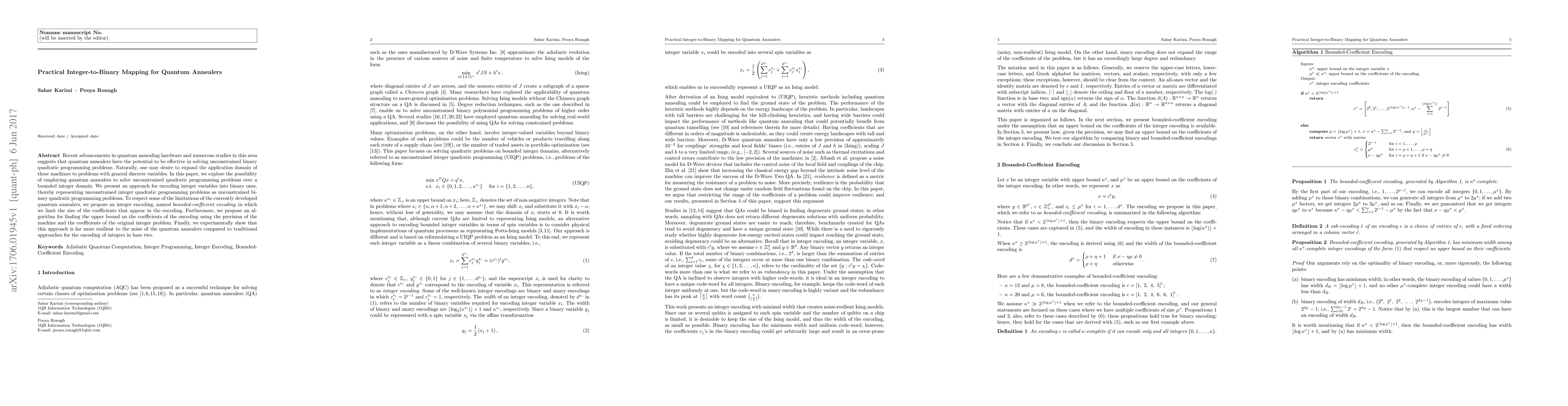 This paper proposes a novel bounded-coefficient encoding method to map integer variables to binary for quantum annealers, enabling them to solve unconstrained integer quadratic programming problems. The approach is shown to be more resilient to quantum annealer noise compared to traditional binary encoding methods.