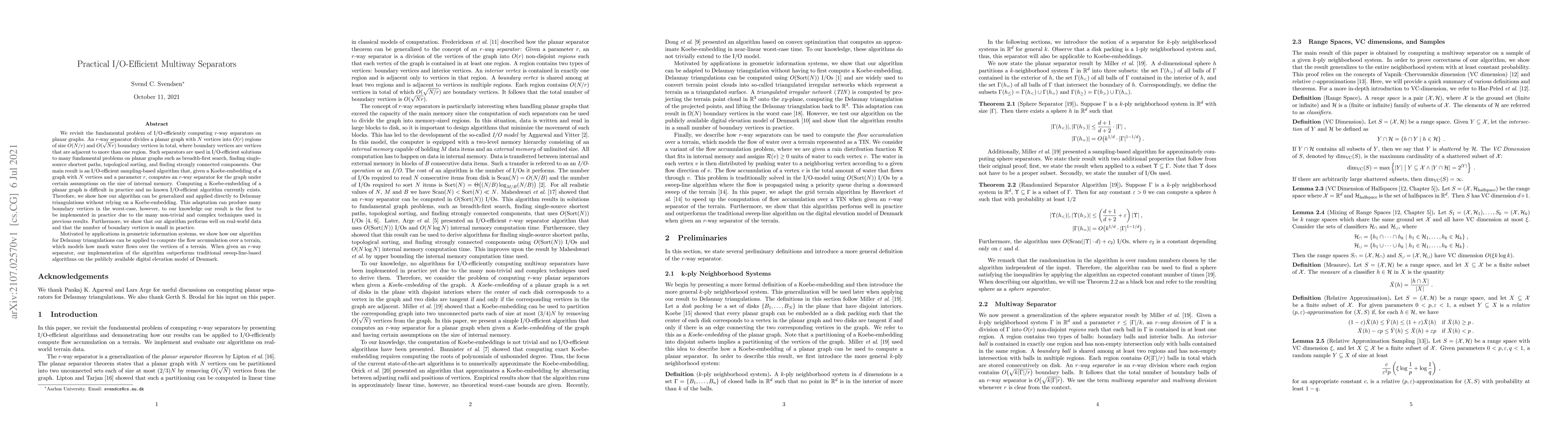 We revisit the fundamental problem of I/O-efficiently computing $r$-way separators on planar graphs. An $r$-way separator divides a planar graph with $N$ vertices into $O(r)$ regions of size $O(N/r)$ and $O(\sqrt {Nr})$ boundary vertices in total, where boundary vertices are vertices that are adjacent to more than one region. Such separators are used in I/O-efficient solutions to many fundamental problems on planar graphs such as breadth-first search, finding single-source shortest paths, topological sorting, and finding strongly connected components. Our main result is an I/O-efficient sampling-based algorithm that, given a Koebe-embedding of a graph with $N$ vertices and a parameter $r$, computes an $r$-way separator for the graph under certain assumptions on the size of internal memory. Computing a Koebe-embedding of a planar graph is difficult in practice and no known I/O-efficient algorithm currently exists. Therefore, we show how our algorithm can be generalized and applied directly to Delaunay triangulations without relying on a Koebe-embedding. This adaptation can produce many boundary vertices in the worst-case, however, to our knowledge our result is the first to be implemented in practice due to the many non-trivial and complex techniques used in previous results. Furthermore, we show that our algorithm performs well on real-world data and that the number of boundary vertices is small in practice. Motivated by applications in geometric information systems, we show how our algorithm for Delaunay triangulations can be applied to compute the flow accumulation over a terrain, which models how much water flows over the vertices of a terrain. When given an $r$-way separator, our implementation of the algorithm outperforms traditional sweep-line-based algorithms on the publicly available digital elevation model of Denmark.