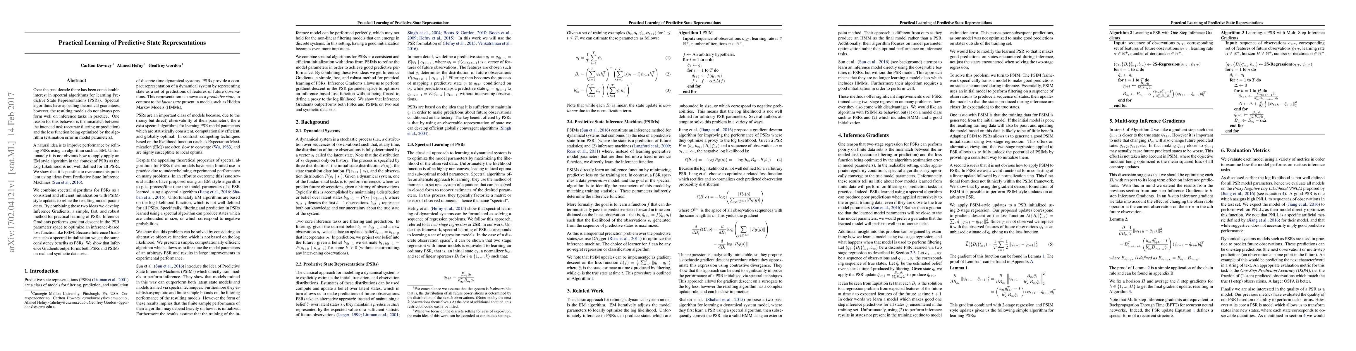 This paper proposes Inference Gradients, a method combining spectral algorithms for initializing Predictive State Representations (PSRs) with PSIM-style updates to refine model parameters, achieving better performance on inference tasks compared to traditional PSRs and PSIMs. The method optimizes an inference-based loss function, demonstrating superior results on both real and synthetic datasets.