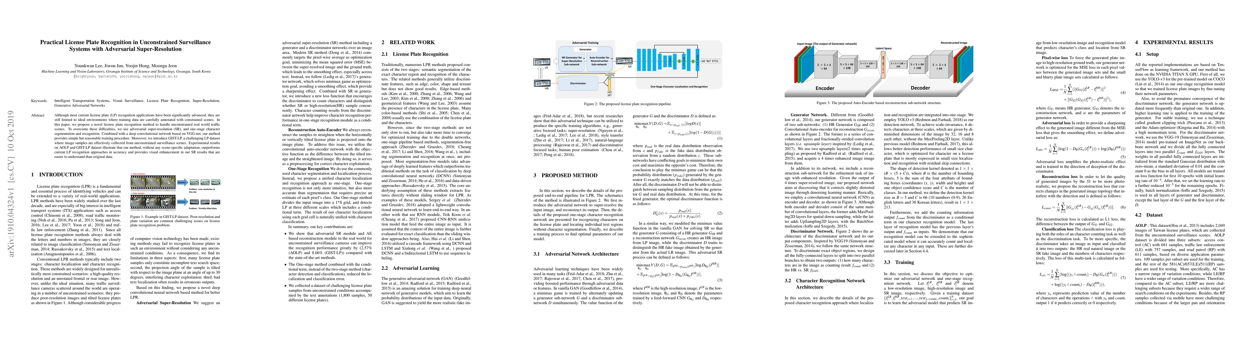 This paper proposes a novel license plate recognition method using adversarial super-resolution and one-stage character segmentation for unconstrained real-world traffic scenes. The method, combined with a VGG-net based convolutional network, achieves superior accuracy and visual enhancement over current approaches, as demonstrated on the newly introduced GIST-LP dataset.