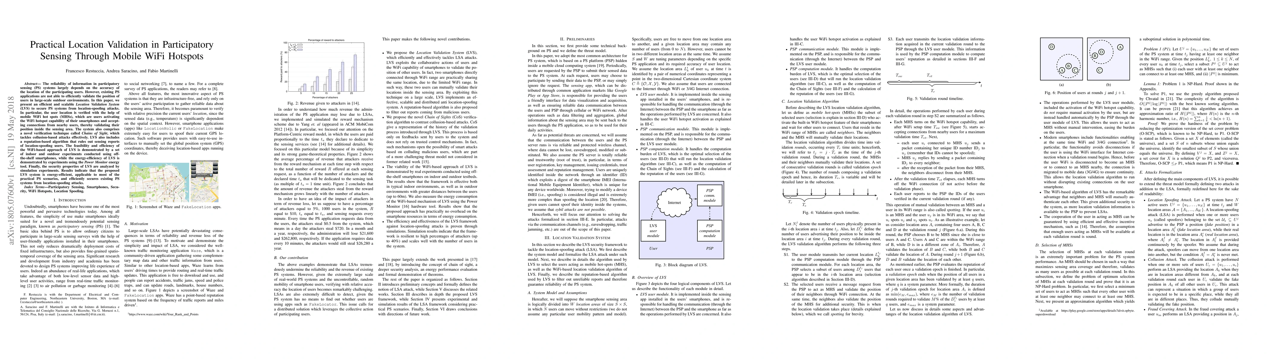 This paper introduces an efficient Location Validation System (LVS) to validate user locations in participatory sensing systems using mobile WiFi hotspots. The LVS employs a Chains of Sight technique and a reputation-based algorithm to secure against location-spoofing and collusion attacks, demonstrating its effectiveness and energy efficiency through practical experiments and simulations.