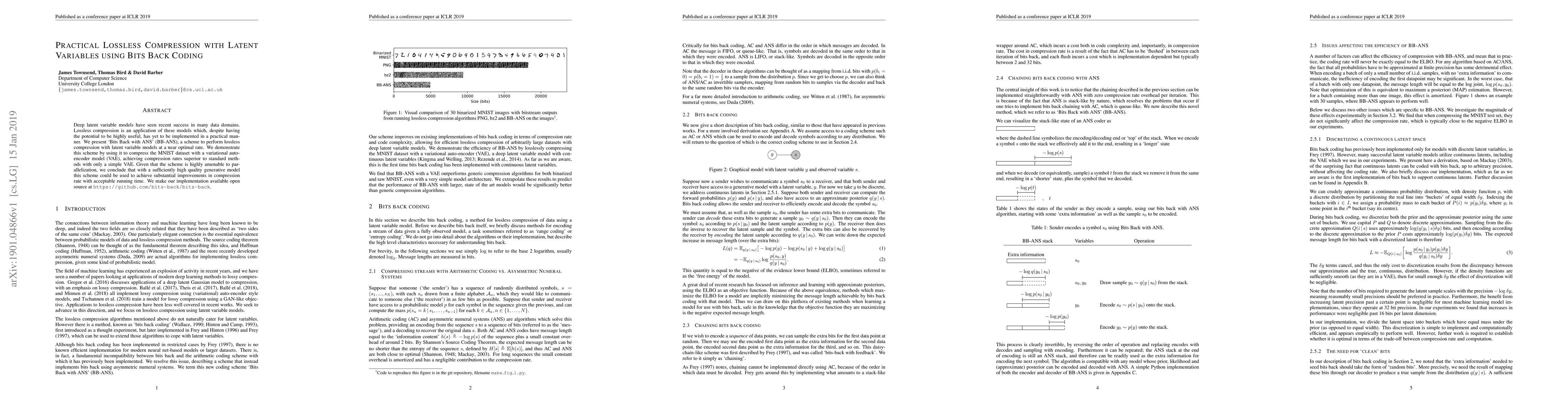 This paper introduces `Bits Back with ANS' (BB-ANS), a novel lossless compression method leveraging latent variable models, specifically demonstrated through a variational auto-encoder (VAE) on the MNIST dataset. The method achieves superior compression rates compared to standard techniques, indicating potential for substantial improvements with high-quality generative models.