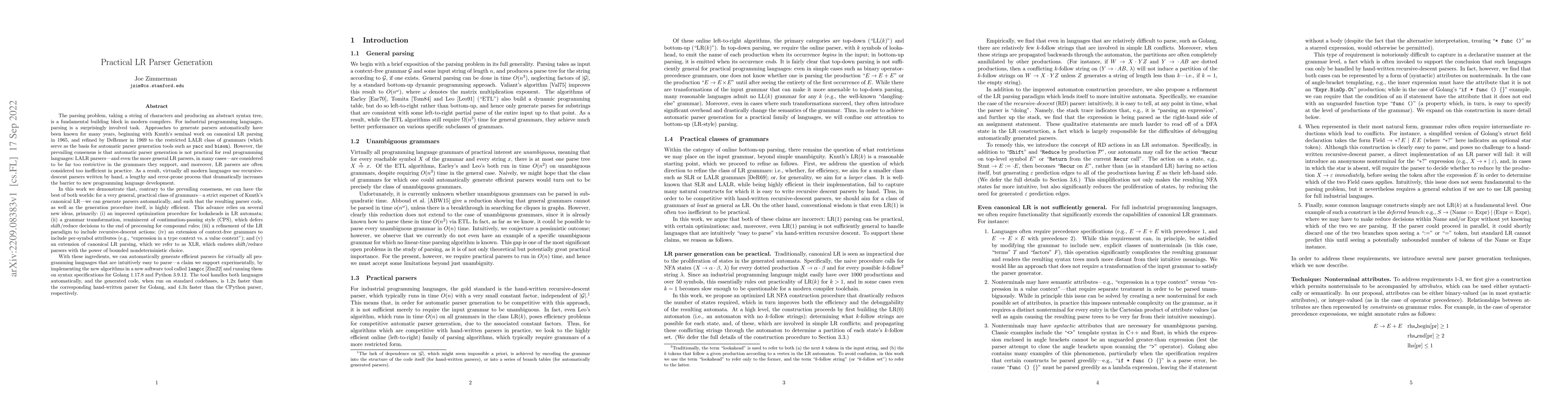 This paper demonstrates that automatic generation of efficient LR parsers is feasible for a broad class of practical programming languages, challenging the conventional belief of their impracticality. The authors introduce new techniques, including optimized automata, grammar transformation, and an extended LR parsing method, to achieve this, showing significant performance improvements via their tool langcc on Golang and Python.