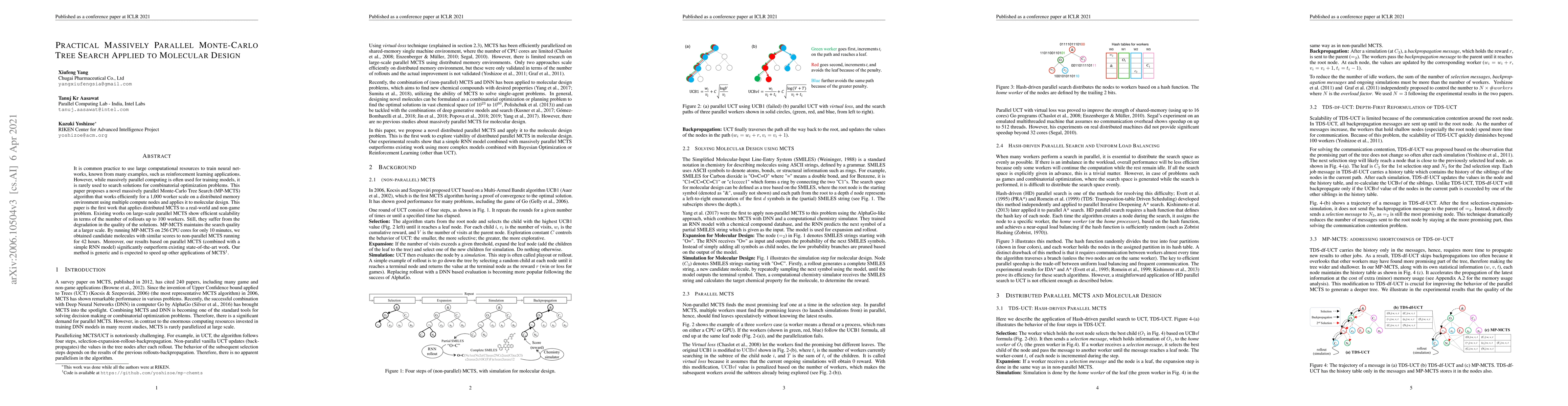This paper introduces a novel massively parallel Monte-Carlo Tree Search (MP-MCTS) algorithm that scales efficiently to 1,000 workers, successfully applied to molecular design. Unlike previous methods, MP-MCTS maintains solution quality at large scales, achieving results comparable to non-parallel MCTS in a fraction of the time, demonstrating significant performance improvements over existing state-of-the-art methods.