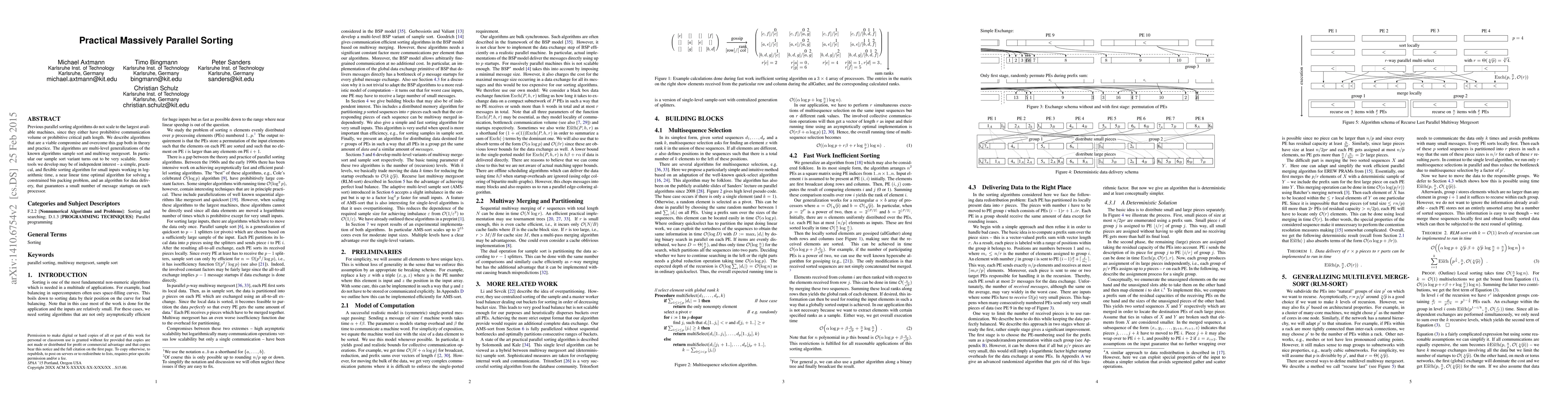 This paper presents scalable massively parallel sorting algorithms that address the limitations of previous methods by balancing communication volume and critical path length. The proposed algorithms, based on multi-level generalizations of sample sort and multiway mergesort, demonstrate practical scalability and include useful tools like a logarithmic time sorting algorithm for small inputs and an optimal bin packing solution.