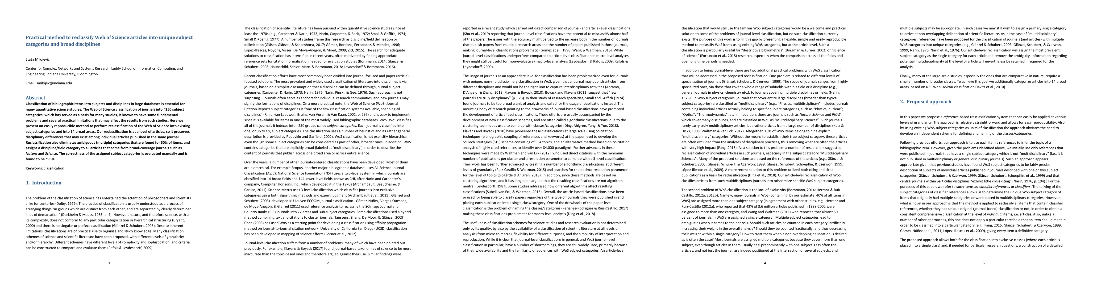 This paper proposes a reproducible method to reclassify Web of Science articles into existing subject categories and 14 broad disciplines, addressing limitations of the original classification. The reclassification preserves disciplinary differences and assigns a discipline to all articles, achieving a manual evaluation accuracy of ~95%.