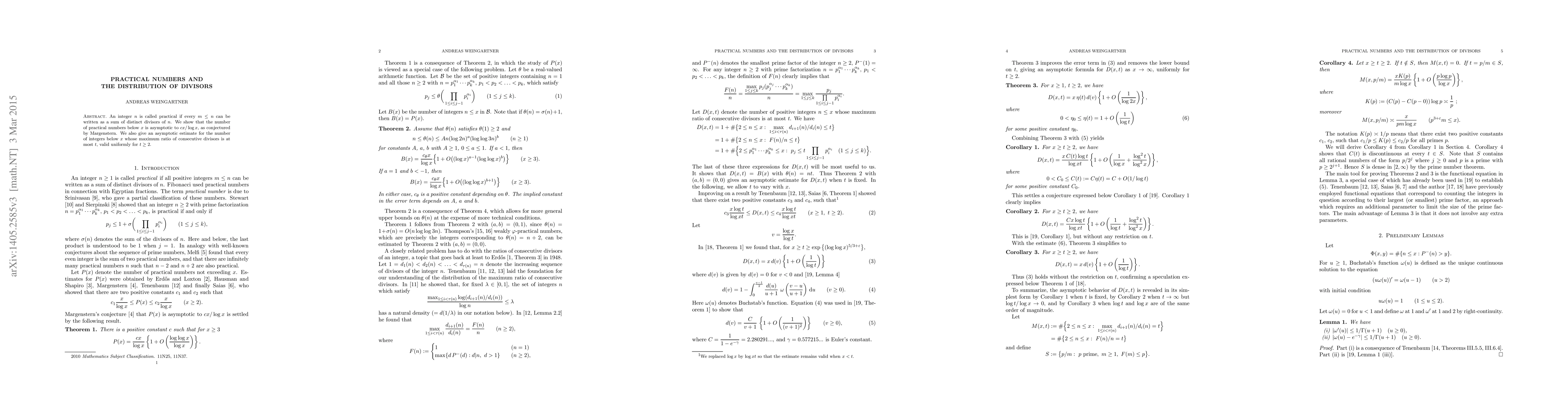 This paper establishes that the number of practical numbers below x is asymptotic to cx/log x, as conjectured by Margenstern, and provides a uniform estimate for integers with a maximum ratio of consecutive divisors at most t.