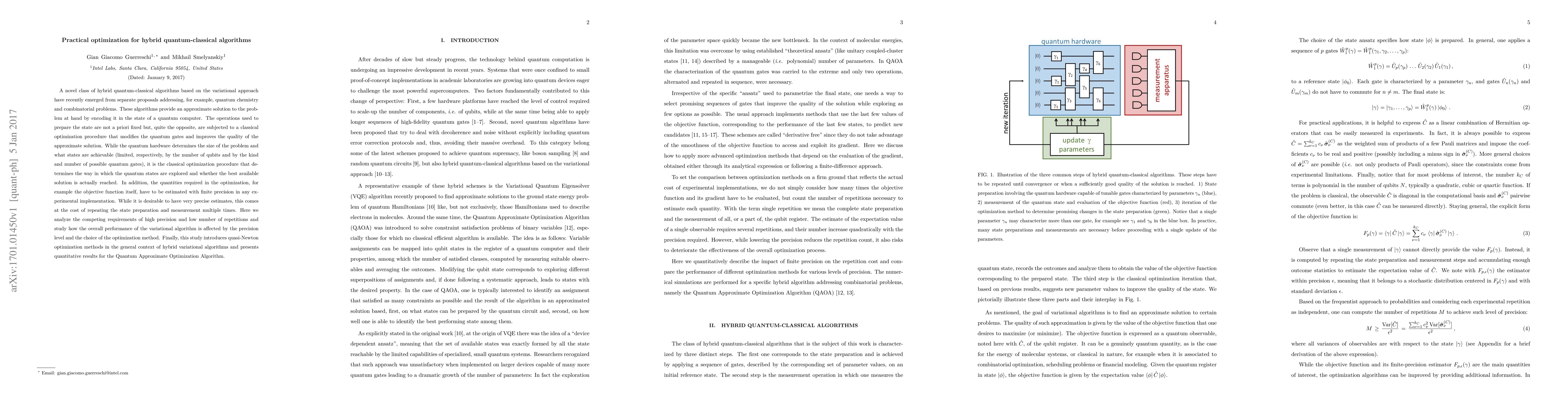 This paper explores optimization strategies for hybrid quantum-classical algorithms, focusing on variational approaches. It examines the trade-off between precision and repetitions in quantum state preparation and optimization, introducing quasi-Newton methods to enhance performance, and provides quantitative results for the Quantum Approximate Optimization Algorithm.