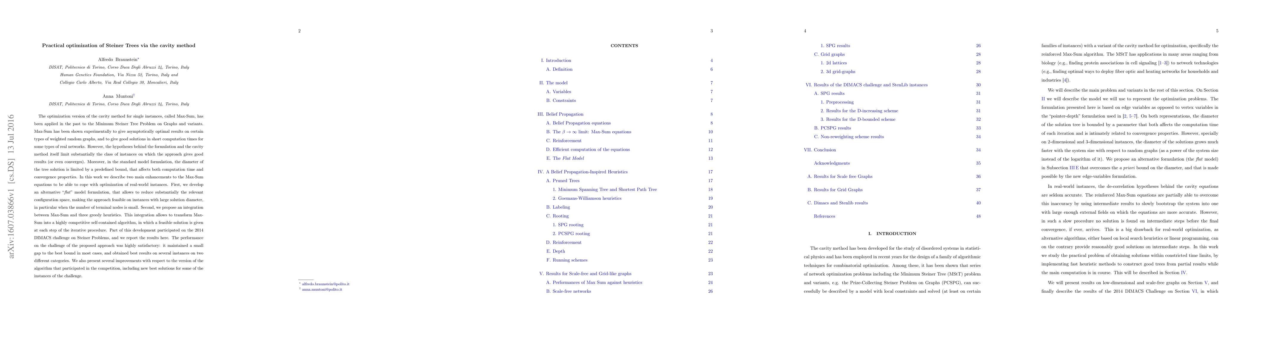This paper presents enhancements to the Max-Sum cavity method for optimizing Steiner Trees, including a 'flat' model formulation to handle large solution diameters and an integration with greedy heuristics for competitive performance on real-world instances. The proposed method was part of the 2014 DIMACS challenge on Steiner Problems.