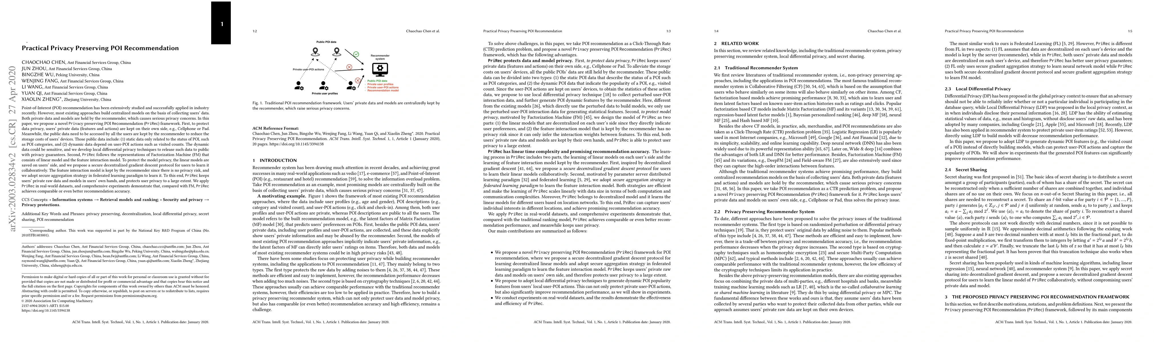 This paper proposes a Privacy preserving POI Recommendation (PriRec) framework that keeps users' private data and models on their devices to protect privacy. It uses local differential privacy for dynamic data and secure decentralized gradient descent for linear models, achieving comparable recommendation accuracy to traditional methods.