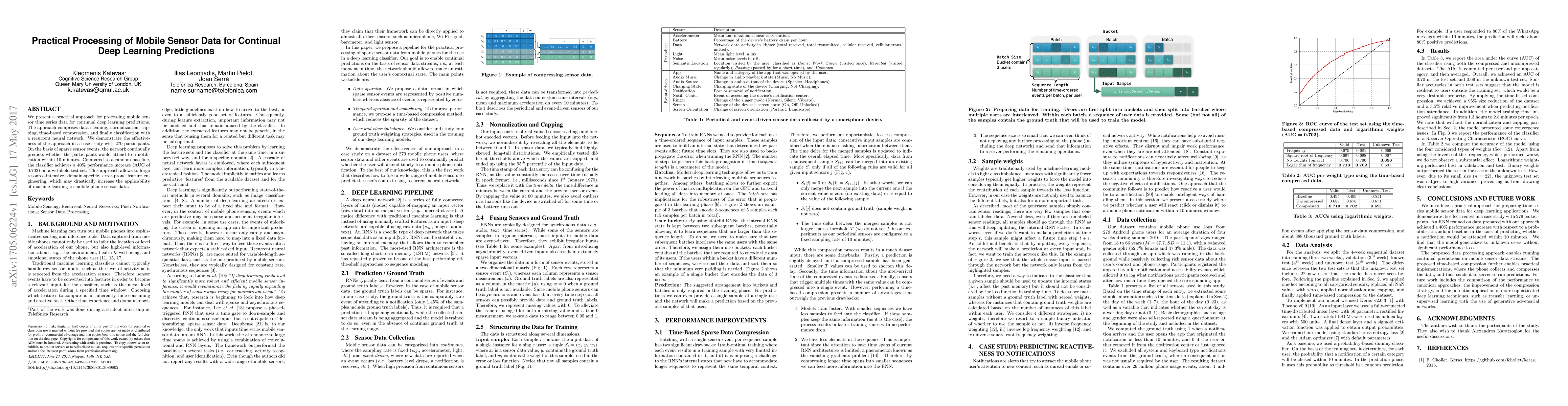 This paper proposes a practical method for processing mobile sensor data to enable continual deep learning predictions, achieving a 40% performance increase over a random baseline. The approach leverages recurrent neural networks after data cleaning, normalization, and time-based compression, eliminating the need for manual feature engineering.