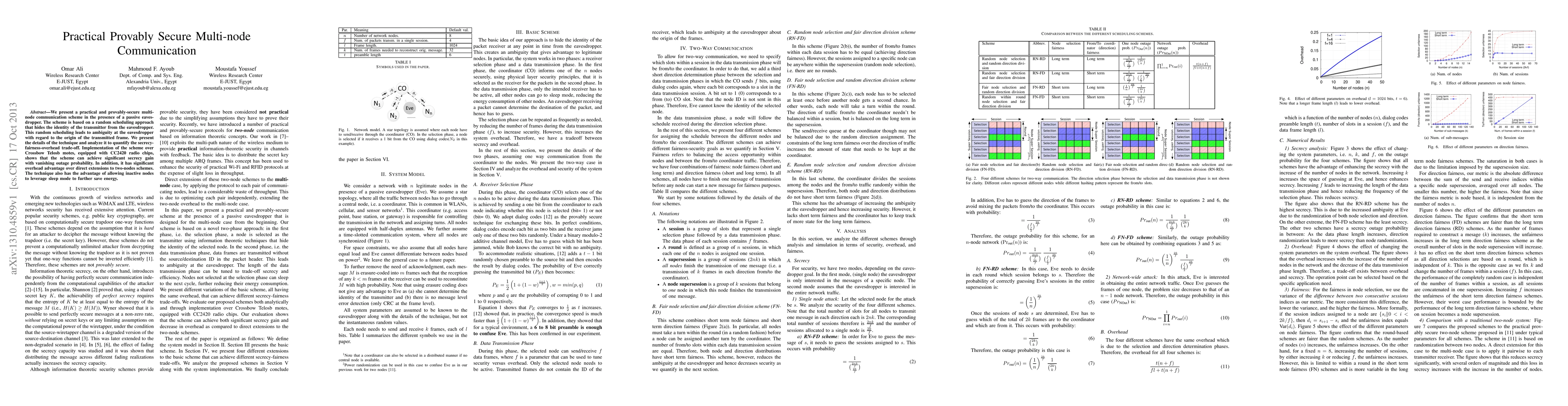 We present a practical and provably-secure multimode communication scheme in the presence of a passive eavesdropper. The scheme is based on a random scheduling approach that hides the identity of the transmitter from the eavesdropper. This random scheduling leads to ambiguity at the eavesdropper with regard to the origin of the transmitted frame. We present the details of the technique and analyze it to quantify the secrecy-fairness-overhead trade-off. Implementation of the scheme over Crossbow Telosb motes, equipped with CC2420 radio chips, shows that the scheme can achieve significant secrecy gain with vanishing outage probability. In addition, it has significant overhead advantage over direct extensions to two-nodes schemes. The technique also has the advantage of allowing inactive nodes to leverage sleep mode to further save energy.