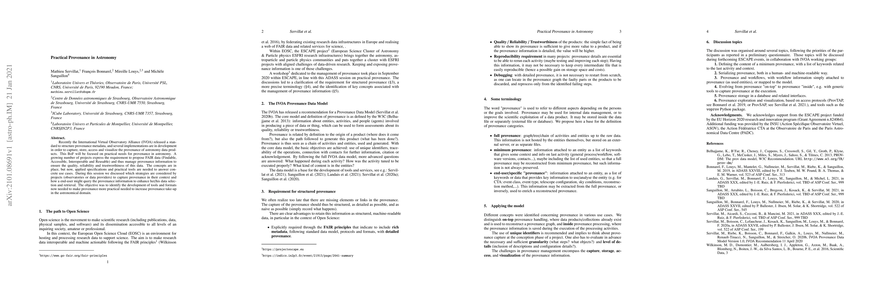 This paper discusses the practical implementation of provenance metadata standards in astronomy, focusing on strategies for capturing and querying provenance information to enhance data quality and trustworthiness. The session aimed to identify tools and formats needed to increase the practical use of provenance in the astronomical domain.