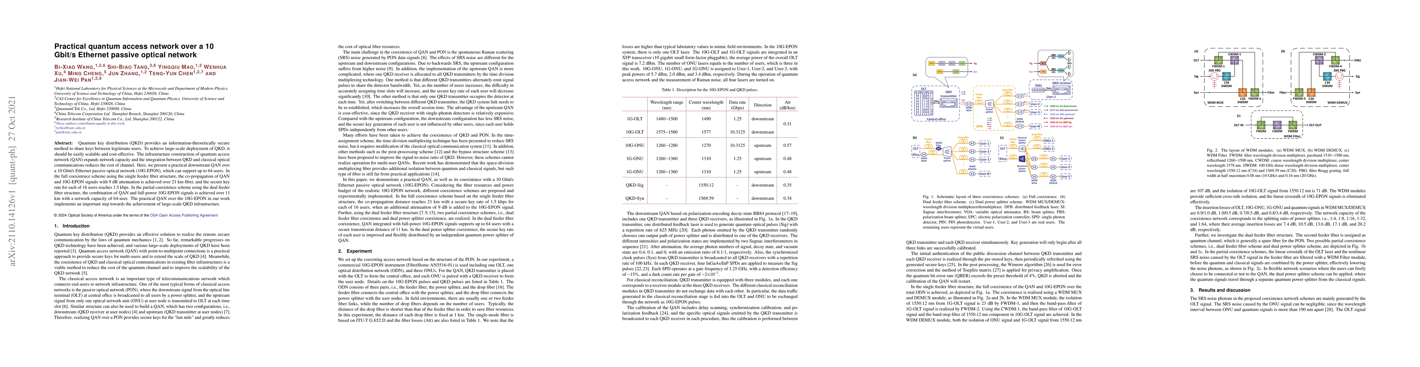This paper presents a practical quantum access network (QAN) integrated with a 10 Gbit/s Ethernet passive optical network (10G-EPON) to support up to 64 users, enabling scalable and cost-effective quantum key distribution (QKD) over long distances. The study demonstrates secure key rates of 1.5 kbps for 16 users in a single feeder fiber structure over 21 km.