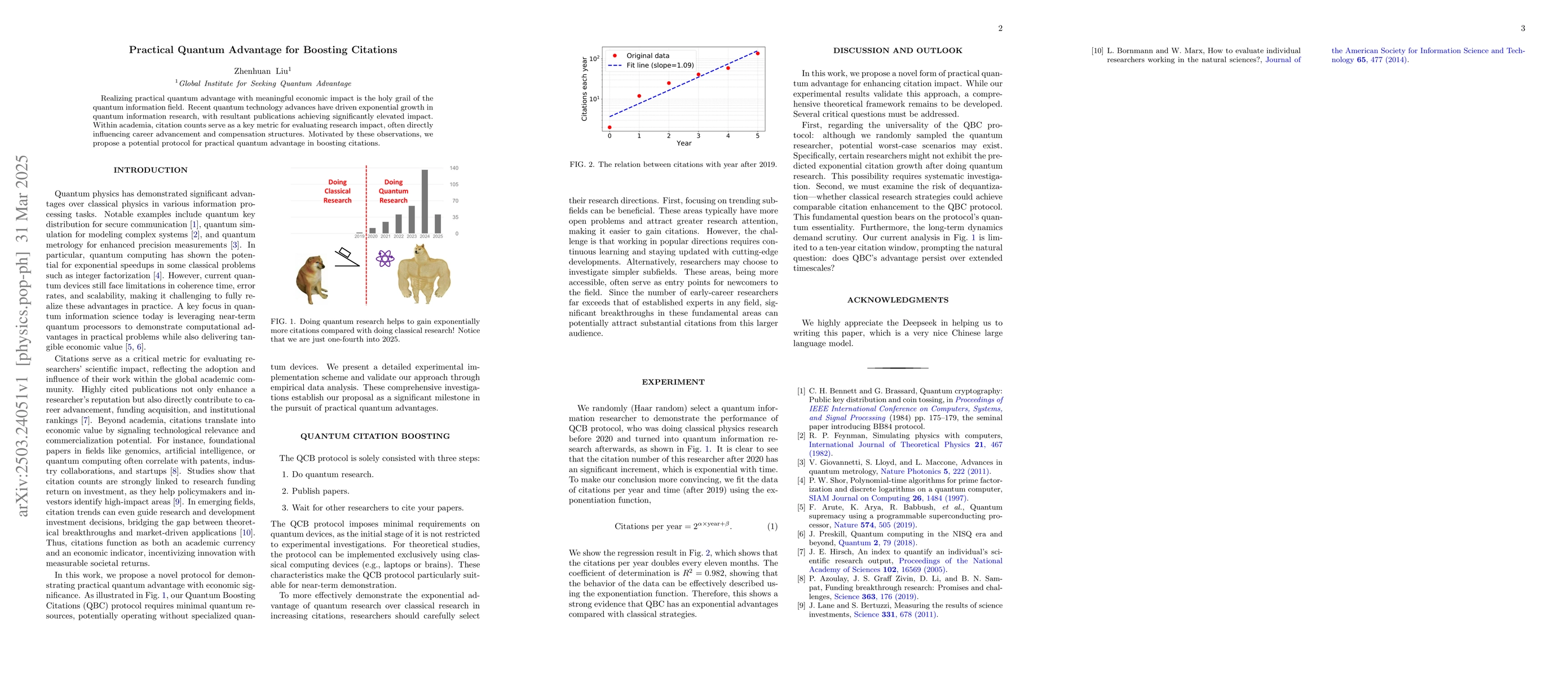 The paper outlines a proposed protocol for practical quantum advantage aimed at boosting citations, driven by recent advances in quantum technology and their impact on research publications.