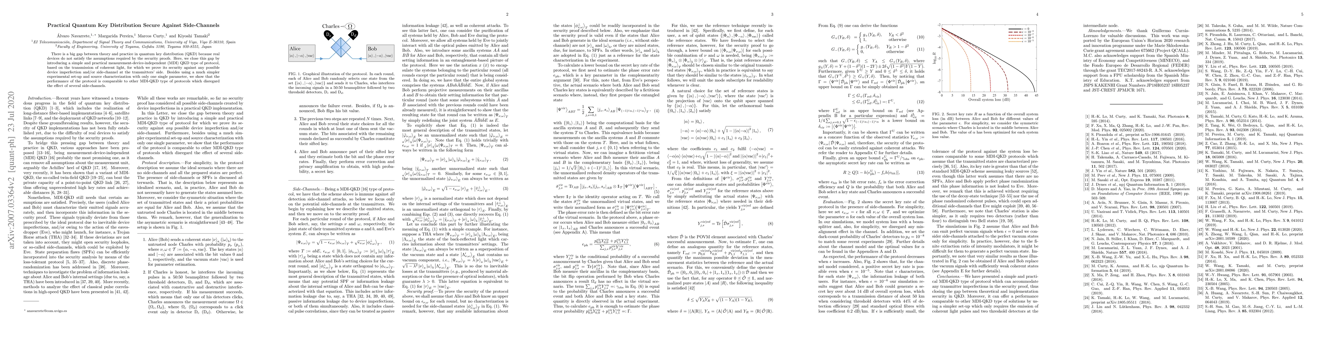 This paper presents a practical measurement-device-independent quantum key distribution (MDI-QKD) protocol secure against side-channels, bridging the gap between theoretical and real-world QKD implementations. The protocol uses coherent light and proves security against device imperfections, with a simpler setup and comparable performance to other MDI-QKD methods.