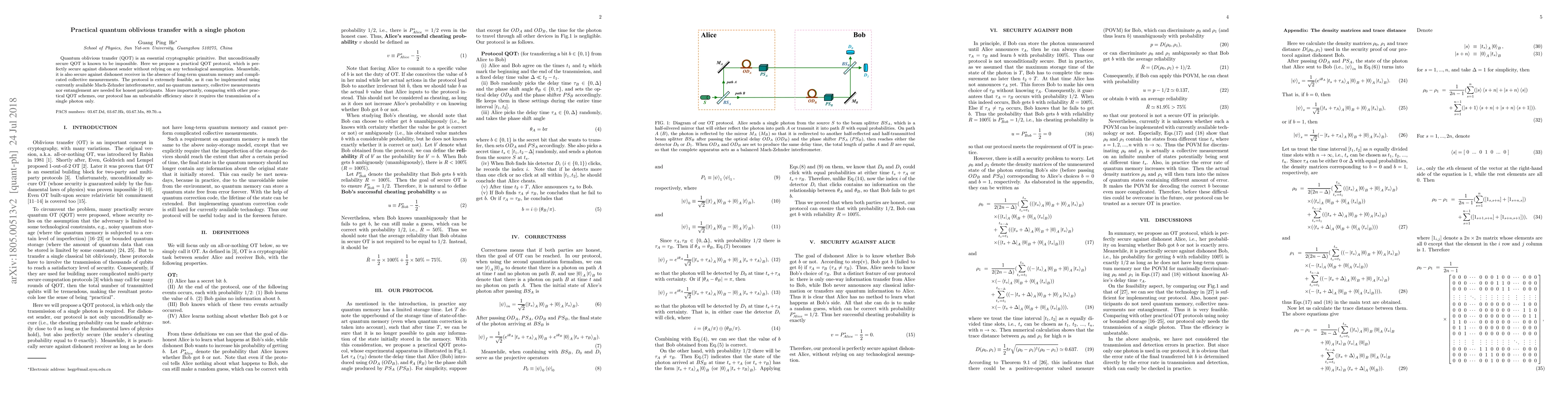 A practical quantum oblivious transfer protocol is proposed that uses a single photon and doesn't rely on complex technology, providing unconditional security against dishonest senders and limited security against dishonest receivers.