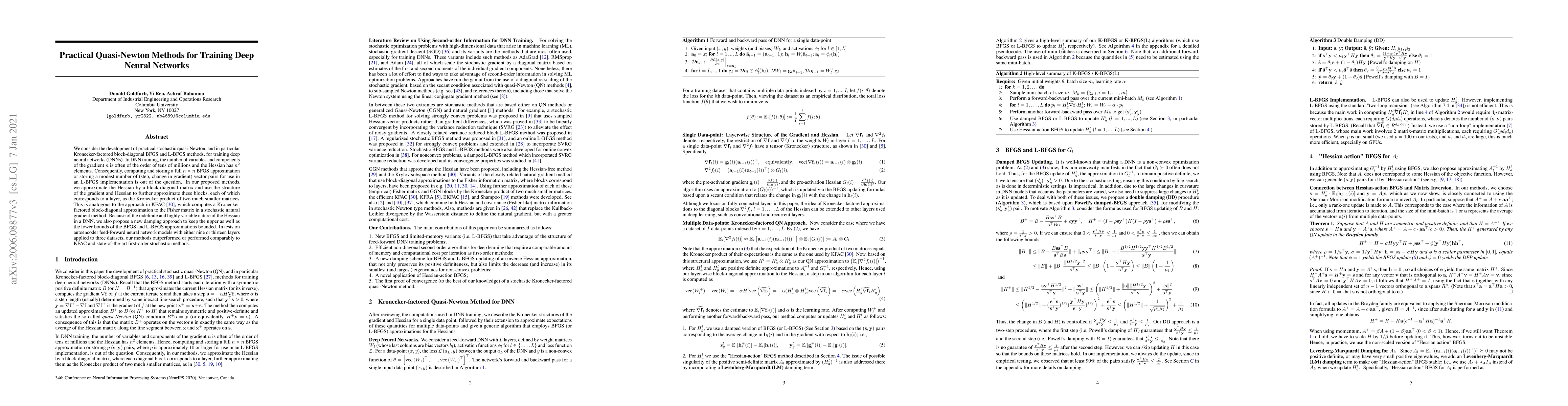 This paper proposes practical quasi-Newton methods, specifically Kronecker-factored block-diagonal BFGS and L-BFGS, for training deep neural networks by approximating the Hessian with a block-diagonal structure. The methods outperform or match KFAC and first-order stochastic methods in training autoencoder feed-forward neural networks on multiple datasets.