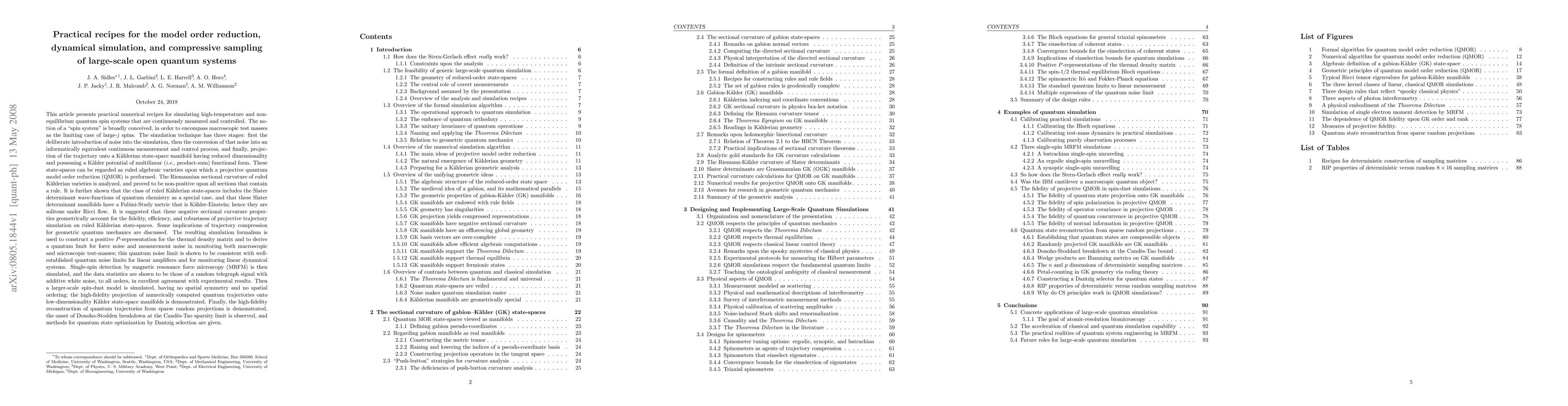 This article presents numerical recipes for simulating high-temperature and non-equilibrium quantum spin systems that are continuously measured and controlled. The notion of a spin system is broadly conceived, in order to encompass macroscopic test masses as the limiting case of large-j spins. The simulation technique has three stages: first the deliberate introduction of noise into the simulation, then the conversion of that noise into an equivalent continuous measurement and control process, and finally, projection of the trajectory onto a state-space manifold having reduced dimensionality and possessing a Kahler potential of multi-linear form. The resulting simulation formalism is used to construct a positive P-representation for the thermal density matrix. Single-spin detection by magnetic resonance force microscopy (MRFM) is simulated, and the data statistics are shown to be those of a random telegraph signal with additive white noise. Larger-scale spin-dust models are simulated, having no spatial symmetry and no spatial ordering; the high-fidelity projection of numerically computed quantum trajectories onto low-dimensionality Kahler state-space manifolds is demonstrated. The reconstruction of quantum trajectories from sparse random projections is demonstrated, the onset of Donoho-Stodden breakdown at the Candes-Tao sparsity limit is observed, a deterministic construction for sampling matrices is given, and methods for quantum state optimization by Dantzig selection are given.