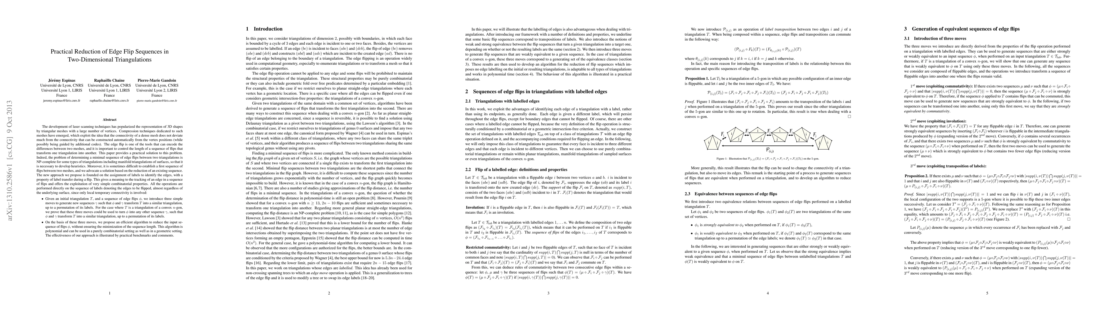 The development of laser scanning techniques has popularized the representation of 3D shapes by triangular meshes with a large number of vertices. Compression techniques dedicated to such meshes have emerged, which exploit the idea that the connectivity of a dense mesh does not deviate much from the connectivity that can be constructed automatically from the vertex positions (while possibly being guided by additional codes). The edge flip is one of the tools that can encode the differences between two meshes, and it is important to control the length of a sequence of flips that transform one triangulation into another. This paper provides a practical solution to this problem. Indeed, the problem of determining a minimal sequence of edge flips between two triangulations is NP-complete for some types of triangulations including manifold triangulations of surfaces, so that it is necessary to develop heuristics. Moreover, it is sometimes difficult to establish a first sequence of flips between two meshes, and we advocate a solution based on the reduction of an existing sequence. The new approach we propose is founded on the assignment of labels to identify the edges, with a property of label transfer during a flip. This gives a meaning to the tracking of an edge in a sequence of flips and offers the exploitation of very simple combinatorial properties. All the operations are performed directly on the sequence of labels denoting the edges to be flipped, almost regardless of the underlying surface, since only local temporary connectivity is involved.