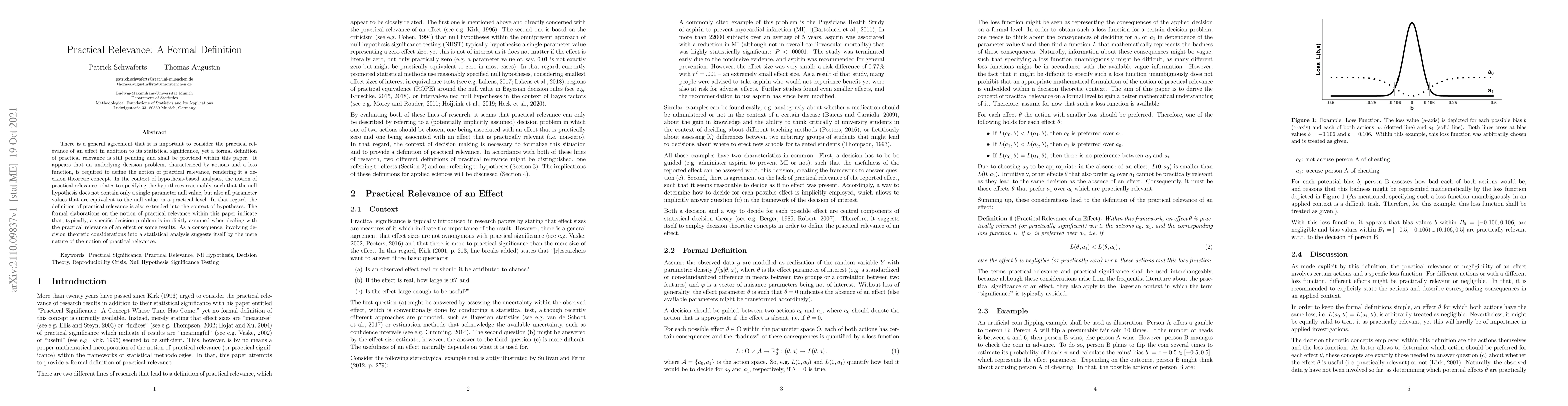 This paper provides a formal definition of practical relevance, emphasizing its decision theoretic nature and its importance in hypothesis-based analyses. It argues that practical relevance is inherently linked to underlying decision problems and loss functions, suggesting that statistical analyses should incorporate these considerations.
