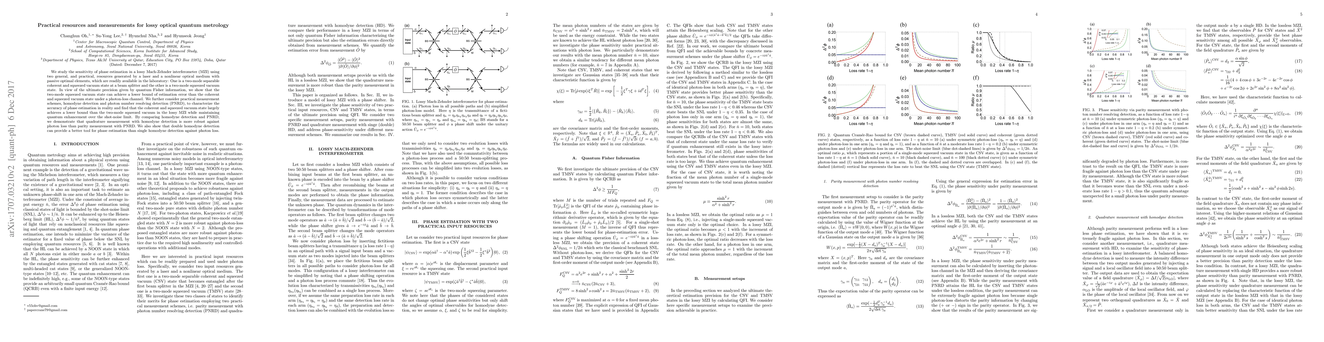 We study the sensitivity of phase estimation in a lossy Mach-Zehnder interferometer (MZI) using two general, and practical, resources generated by a laser and a nonlinear optical medium with passive optimal elements, which are readily available in the laboratory: One is a two-mode separable coherent and squeezed vacuum state at a beam splitter and the other is a two-mode squeezed vacuum state. In view of the ultimate precision given by quantum Fisher information, we show that the two-mode squeezed vacuum state can achieve a lower bound of estimation error than the coherent and squeezed vacuum state under a photon-loss channel. We further consider practical measurement schemes, homodyne detection and photon number resolving detection (PNRD), to characterize the accuracy of phase estimation in reality and find that the coherent and squeezed vacuum state largely achieves a lower bound than the two-mode squeezed vacuum in the lossy MZI while maintaining quantum enhancement over the shot-noise limit. By comparing homodyne detection and PNRD, we demonstrate that quadrature measurement with homodyne detection is more robust against photon loss than parity measurement with PNRD. We also show that double homodyne detection can provide a better tool for phase estimation than single homodyne detection against photon loss.