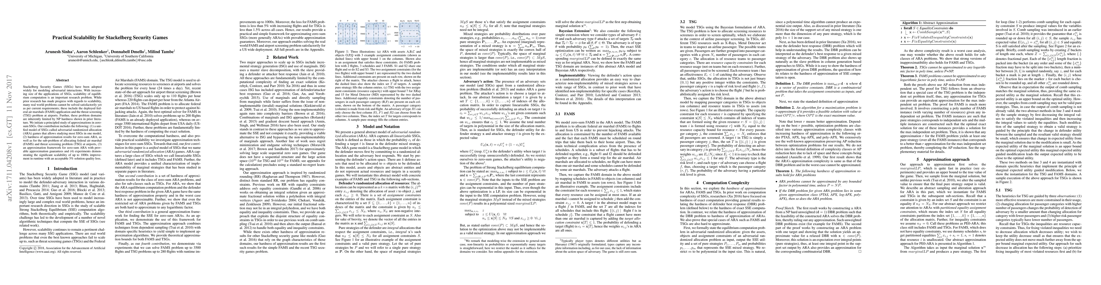 Stackelberg Security Games (SSGs) have been adopted widely for modeling adversarial interactions. With increasing size of the applications of SSGs, scalability of equilibrium computation is an important research problem. While prior research has made progress with regards to scalability, many real world problems cannot be solved satisfactorily yet as per current requirements; these include the deployed federal air marshals (FAMS) application and the threat screening (TSG) problem at airports. Further, these problem domains are inherently limited by NP hardness shown in prior literature. We initiate a principled study of approximations in zero-sum SSGs. Our contribution includes the following: (1) a unified model of SSGs called adversarial randomized allocation (ARA) games that allows studying most SSGs in one model, (2) hardness of approximation results for zero-sum ARA, as well as for the sub-problem of allocating federal air marshal (FAMS) and threat screening problem (TSG) at airports, (3) an approximation framework for zero-sum ARA with provable approximation guarantees and (4) experiments demonstrating the significant scalability of up to 1000x improvement in runtime with an acceptable 5% solution quality loss.
