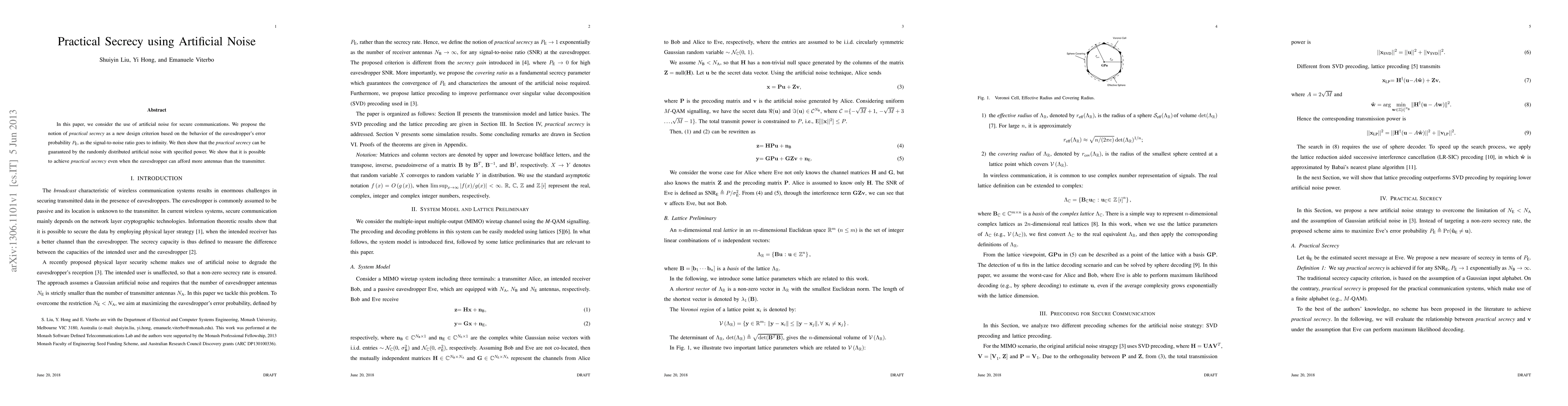 This paper introduces practical secrecy as a new design criterion for secure communications using artificial noise, demonstrating that it can be achieved by randomly distributed artificial noise with specified power, even when the eavesdropper has more antennas than the transmitter.