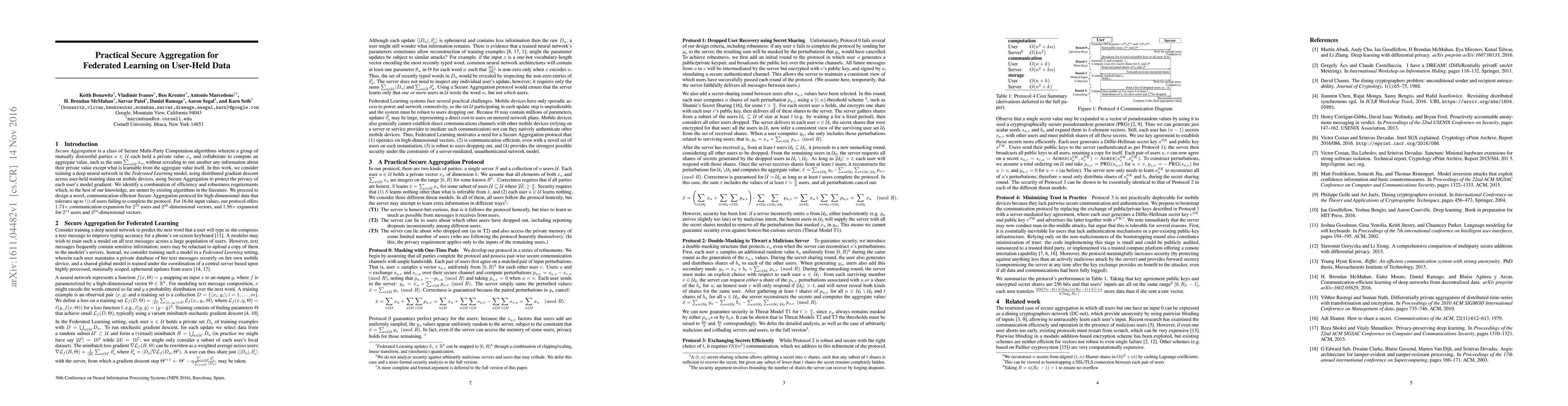 This paper proposes a novel, communication-efficient Secure Aggregation protocol for Federated Learning on user-held data, enabling secure computation of model gradients without revealing individual data. The protocol can tolerate up to 1/3 users failing and offers communication expansion of 1.73x for large user and high-dimensional vector scenarios.