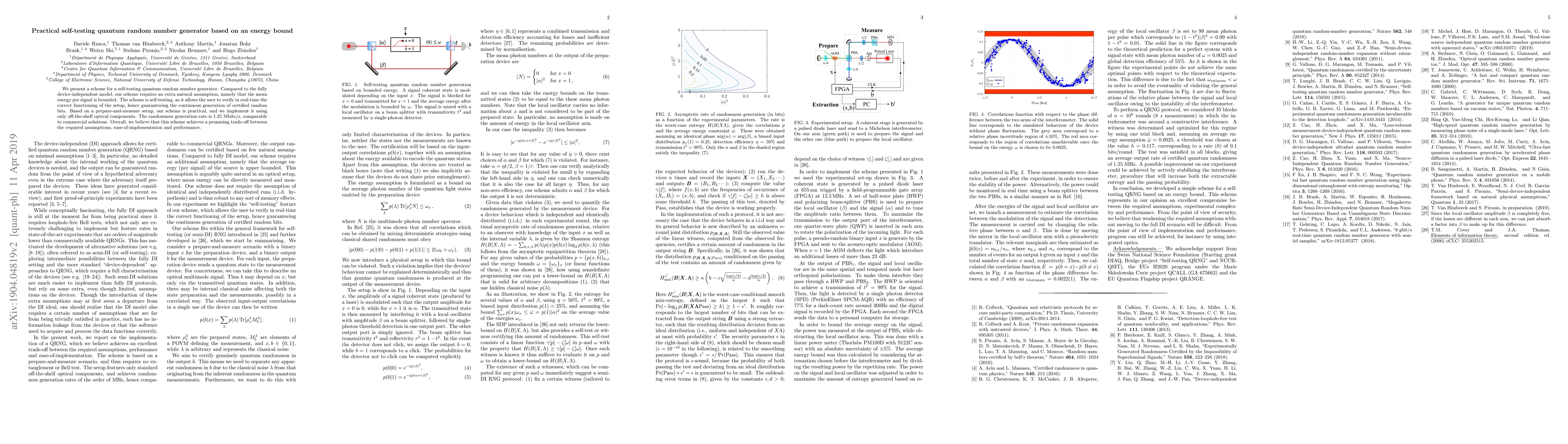 This paper proposes a practical self-testing quantum random number generator that operates under a prepare-and-measure setup using off-the-shelf optical components. It requires an additional assumption of bounded mean energy per signal, offering real-time verification of the setup's correct functioning and achieving a randomness generation rate of 1.25 Mbits/s.