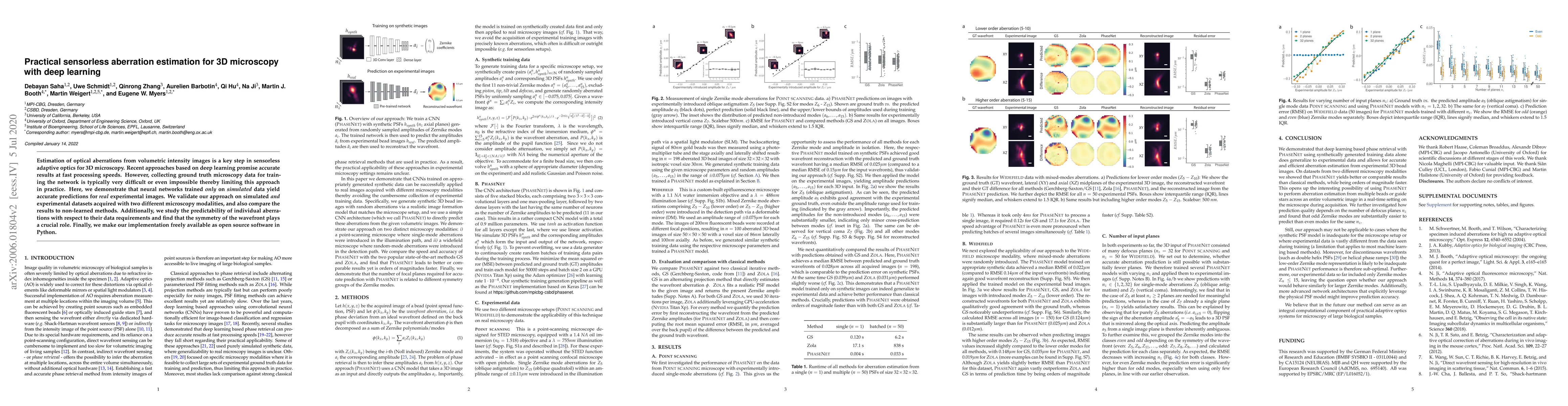 This paper presents a deep learning method for estimating optical aberrations in 3D microscopy using only simulated data, achieving accurate predictions for real images. The approach is validated across different microscopy modalities and is made available as open-source software.
