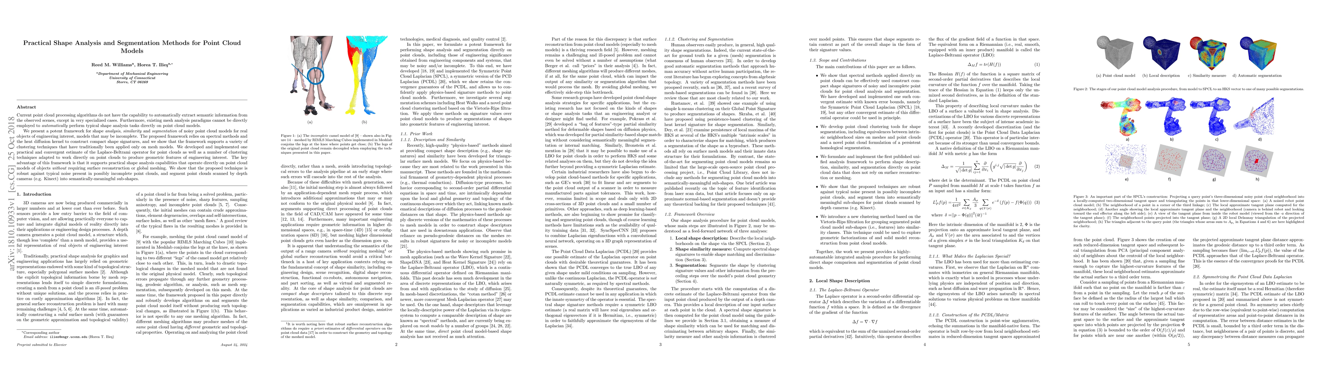 This paper introduces a framework for shape analysis and segmentation of noisy, incomplete point cloud models using spectral methods and heat diffusion kernels, enabling practical shape analysis directly on point clouds without requiring surface reconstruction. The proposed techniques are robust to noise and effectively segment point clouds into semantically meaningful sub-shapes.