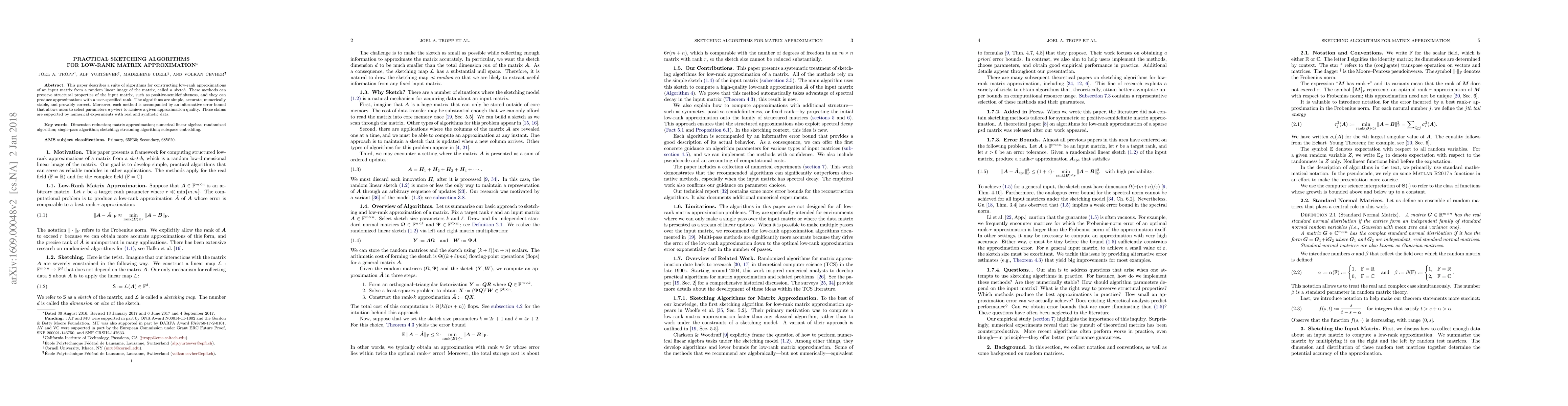 This paper describes a suite of algorithms for constructing low-rank approximations of an input matrix from a random linear image of the matrix, called a sketch. These methods can preserve structural properties of the input matrix, such as positive-semidefiniteness, and they can produce approximations with a user-specified rank. The algorithms are simple, accurate, numerically stable, and provably correct. Moreover, each method is accompanied by an informative error bound that allows users to select parameters a priori to achieve a given approximation quality. These claims are supported by numerical experiments with real and synthetic data.