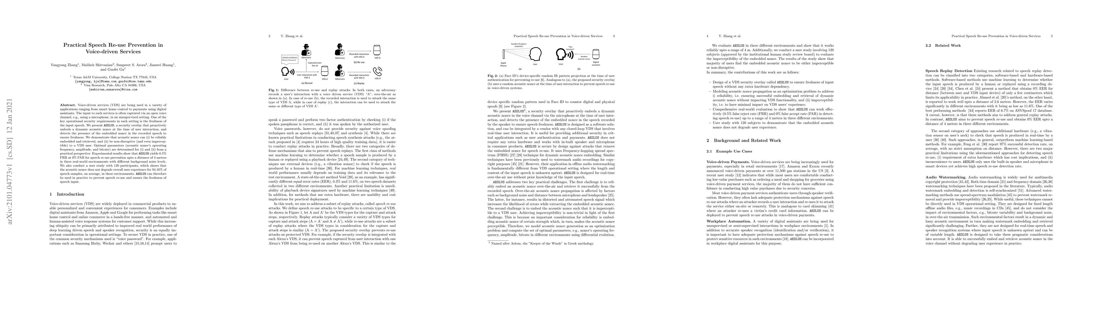 The research introduces AEOLUS, a security overlay that inserts a dynamic acoustic nonce into voice inputs for voice-driven services to ensure freshness and prevent speech re-use. Experiments show AEOLUS effectively detects re-used speech within 4 meters in diverse environments, with minimal impact on user experience for 94.16% of speech samples.