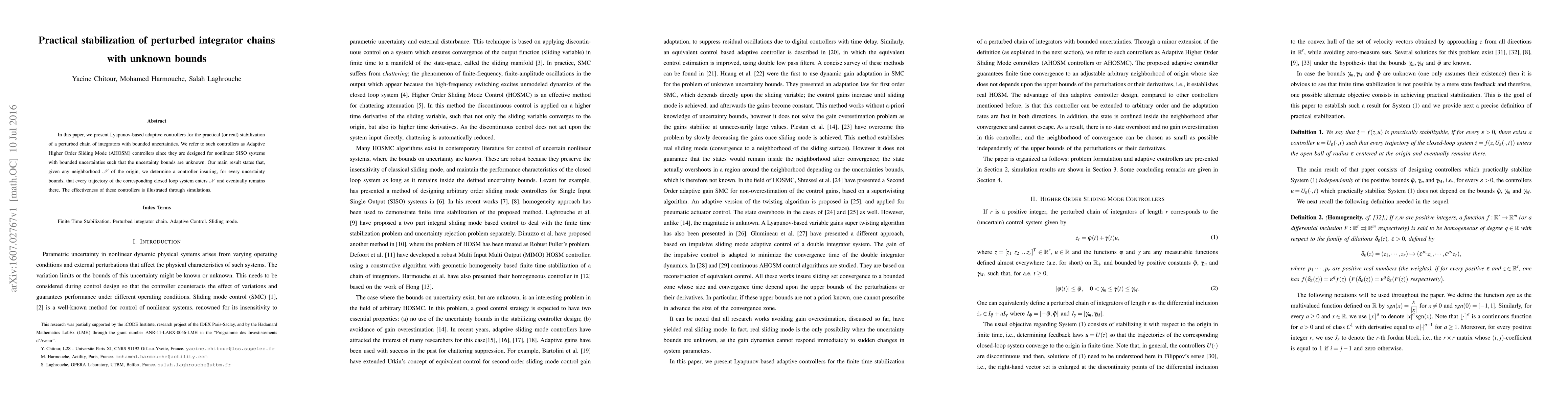 In this paper, we present Lyapunov-based adaptive controllers for the practical (or real) stabilization of a perturbed chain of integrators with bounded uncertainties. We refer to such controllers as Adaptive Higher Order Sliding Mode (AHOSM) controllers since they are designed for nonlinear SISO systems with bounded uncertainties such that the uncertainty bounds are unknown. Our main result states that, given any neighborhood N of the origin, we determine a controller insuring, for every uncertainty bounds, that every trajectory of the corresponding closed loop system enters N and eventually remains there. The effectiveness of these controllers is illustrated through simulations.