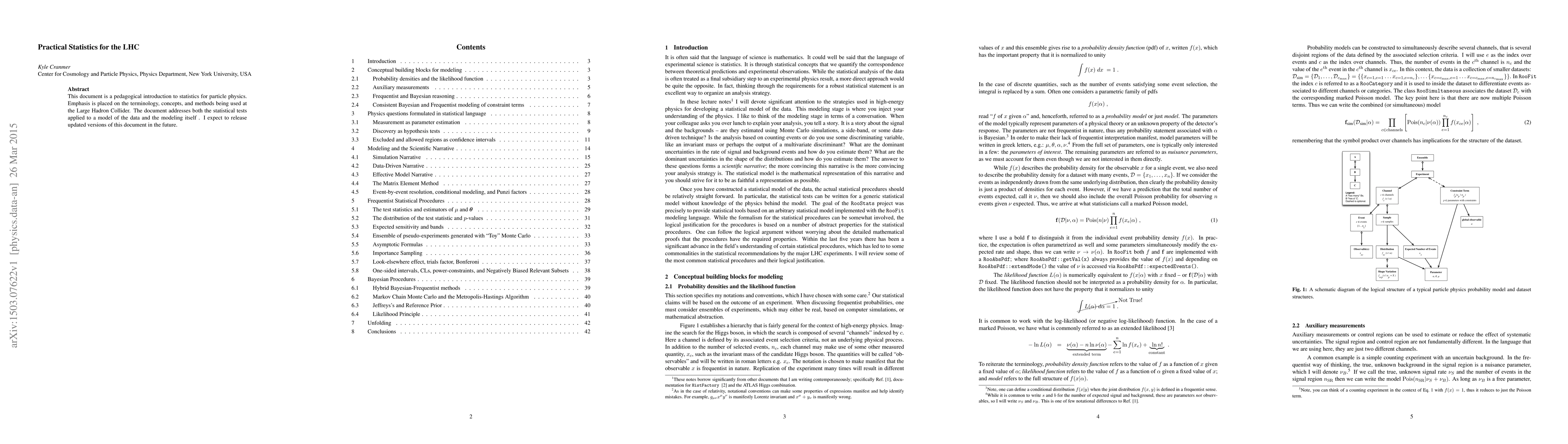 This document provides a pedagogical introduction to statistics for particle physics, emphasizing terminology, concepts, and methods used at the Large Hadron Collider, focusing on both statistical tests applied to data models and the modeling process itself.
