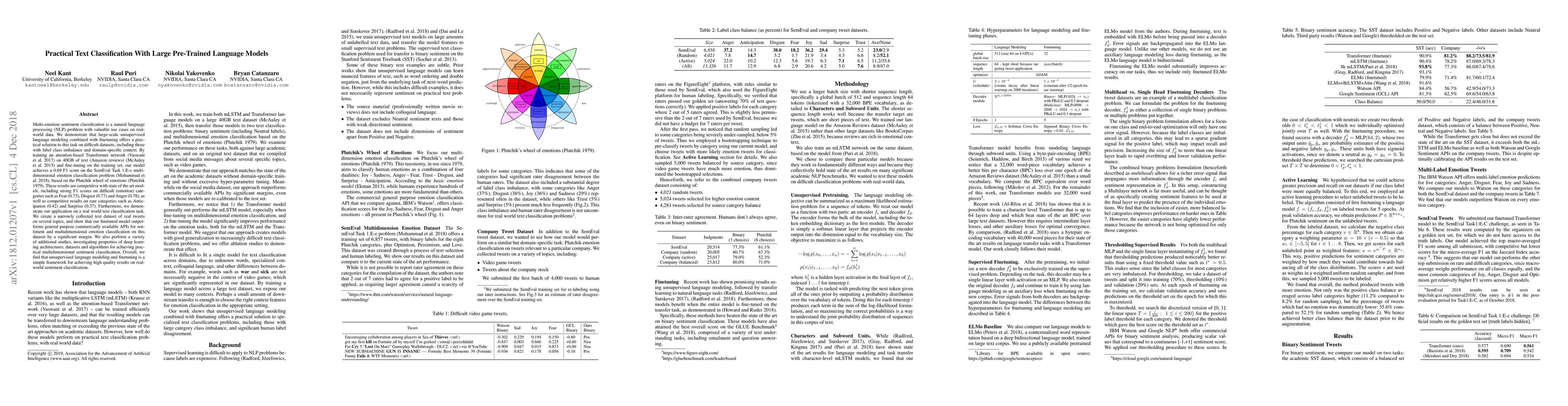 Multi-emotion sentiment classification is a natural language processing (NLP) problem with valuable use cases on real-world data. We demonstrate that large-scale unsupervised language modeling combined with finetuning offers a practical solution to this task on difficult datasets, including those with label class imbalance and domain-specific context. By training an attention-based Transformer network (Vaswani et al. 2017) on 40GB of text (Amazon reviews) (McAuley et al. 2015) and fine-tuning on the training set, our model achieves a 0.69 F1 score on the SemEval Task 1:E-c multi-dimensional emotion classification problem (Mohammad et al. 2018), based on the Plutchik wheel of emotions (Plutchik 1979). These results are competitive with state of the art models, including strong F1 scores on difficult (emotion) categories such as Fear (0.73), Disgust (0.77) and Anger (0.78), as well as competitive results on rare categories such as Anticipation (0.42) and Surprise (0.37). Furthermore, we demonstrate our application on a real world text classification task. We create a narrowly collected text dataset of real tweets on several topics, and show that our finetuned model outperforms general purpose commercially available APIs for sentiment and multidimensional emotion classification on this dataset by a significant margin. We also perform a variety of additional studies, investigating properties of deep learning architectures, datasets and algorithms for achieving practical multidimensional sentiment classification. Overall, we find that unsupervised language modeling and finetuning is a simple framework for achieving high quality results on real-world sentiment classification.