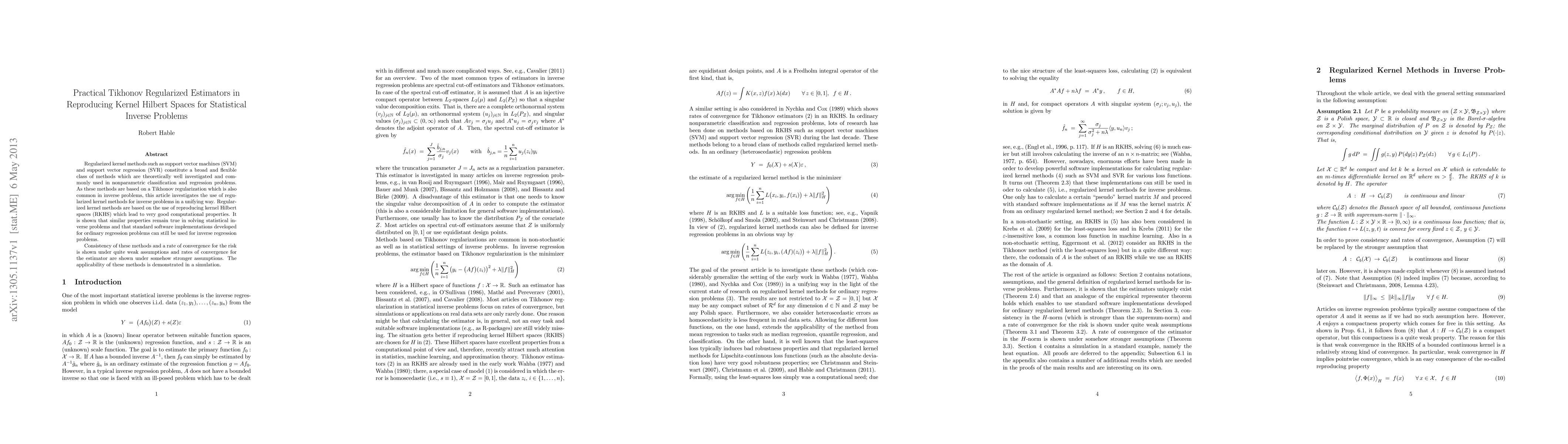 This paper explores the application of Tikhonov regularized kernel methods, such as SVM and SVR, to statistical inverse problems using reproducing kernel Hilbert spaces (RKHS). It demonstrates the consistency and convergence rates of these methods under weak assumptions, showing their practical applicability through simulations.