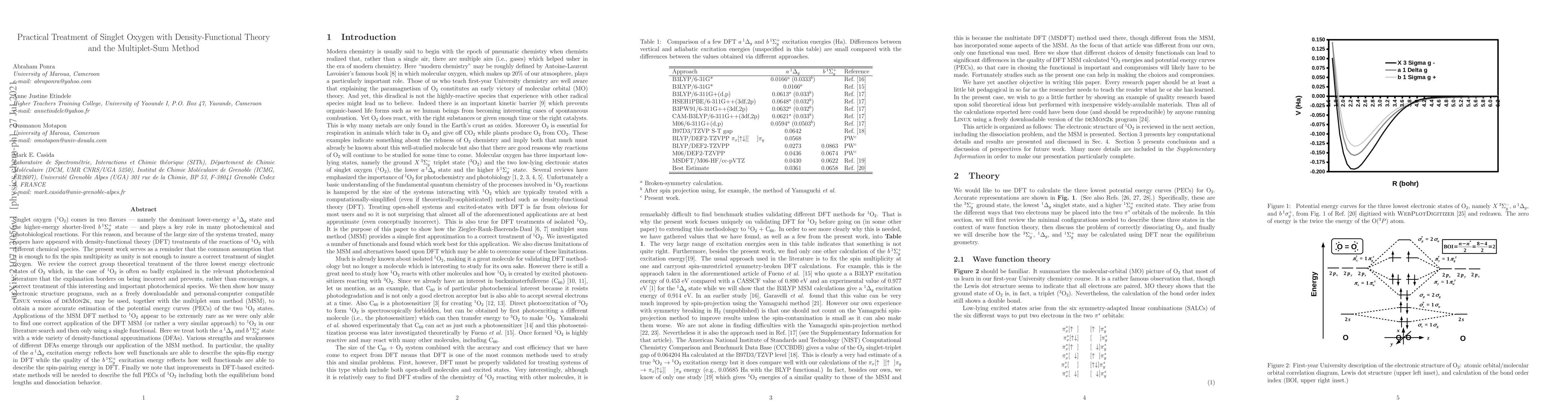 Singlet oxygen (O2) comes in two flavors -- namely the dominant lower-energy a 1 Delta g state and the higher-energy shorter-lived b 1 Sigma + g state -- and plays a key role in many photochemical and photobiological reactions. For this reason, and because of the large size of the systems treated, many papers have appeared with density-functional theory (DFT) treatments of the reactions of 1 O 2 with different chemical species. The present work serves as a reminder that the common assumption that it is enough to fix the spin multipicity as unity is not enough to insure a correct treatment of singlet oxygen. We review the correct group theoretical treatment of the three lowest energy electronic states of O 2 which, in the case of 1 O 2 is often so badly explained in the relevant photochemical literature that the explanation borders on being incorrect and prevents, rather than encourages, a correct treatment of this interesting and important photochemical species. We then show how many electronic structure programs, such as a freely downloadable and personal-computer compatible Linux version of deMon2k, may be used, together with the multiplet sum method (MSM), to obtain a more accurate estimation of the potential energy curves (PECs) of the two 1 O 2 states. Various strengths and weaknesses of different DFAs emerge through our application of the MSM method. In particular, the quality of the a 1 Delta g excitation energy reflects how well functionals are able to describe the spin-flip energy in DFT while the quality of the b 1 Sigma + g excitation energy reflects how well functionals are able to describe the spin-pairing energy in DFT. Finally we note that improvements in DFT-based excited-state methods will be needed to describe the full PECs of 1 O 2 including both the equilibrium bond lengths and dissociation behavior.