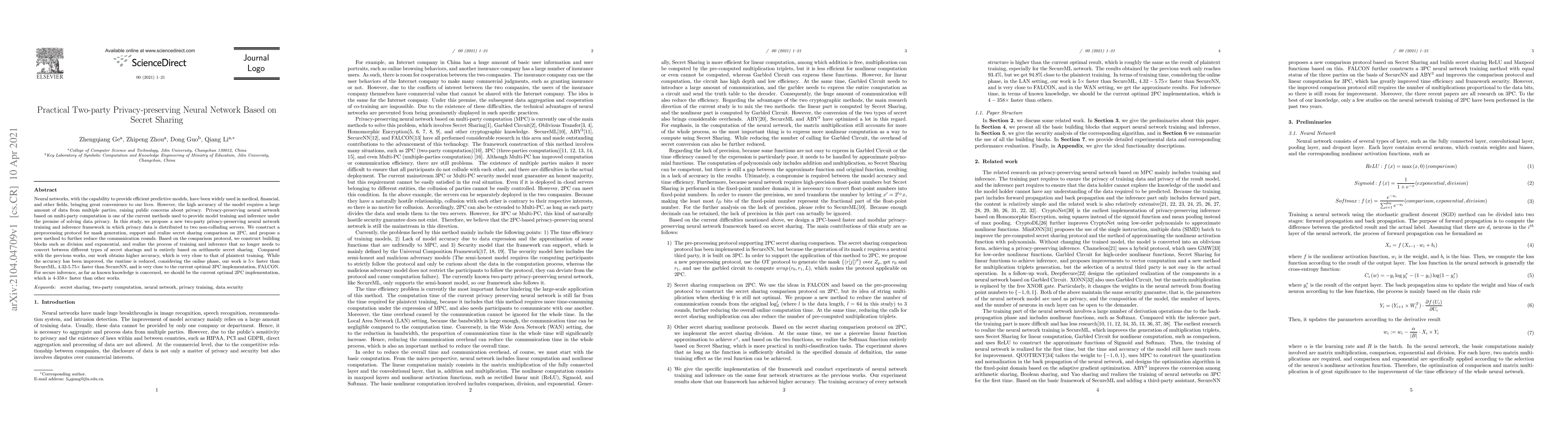 This paper proposes a two-party privacy-preserving neural network framework using secret sharing to train and infer models without compromising data privacy. The method achieves high accuracy and significantly reduces runtime compared to existing solutions, making it a near-optimal 2PC implementation for secure inference.