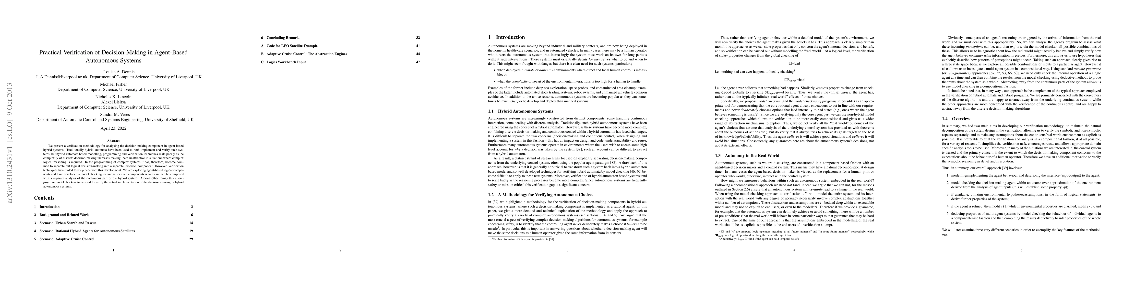 We present a verification methodology for analysing the decision-making component in agent-based hybrid systems. Traditionally hybrid automata have been used to both implement and verify such systems, but hybrid automata based modelling, programming and verification techniques scale poorly as the complexity of discrete decision-making increases making them unattractive in situations where complex logical reasoning is required. In the programming of complex systems it has, therefore, become common to separate out logical decision-making into a separate, discrete, component. However, verification techniques have failed to keep pace with this development. We are exploring agent-based logical components and have developed a model checking technique for such components which can then be composed with a separate analysis of the continuous part of the hybrid system. Among other things this allows program model checkers to be used to verify the actual implementation of the decision-making in hybrid autonomous systems.
