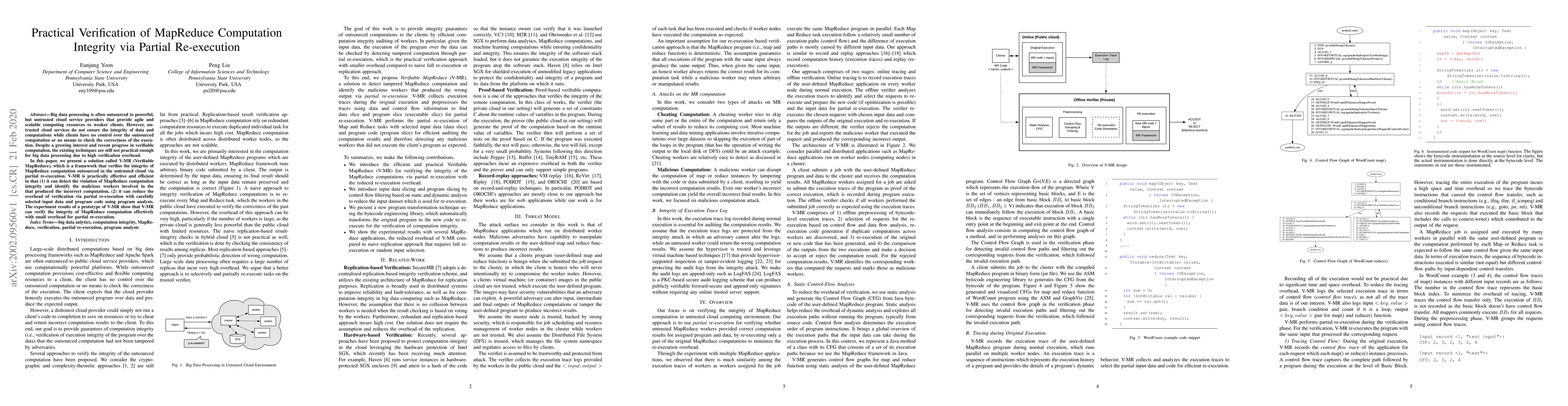 This paper introduces V-MR, a framework for verifying the integrity of MapReduce computations outsourced to untrusted cloud services, using partial re-execution to detect violations and identify malicious workers while minimizing overhead. Experimental results demonstrate V-MR's effectiveness with minimal verification cost.