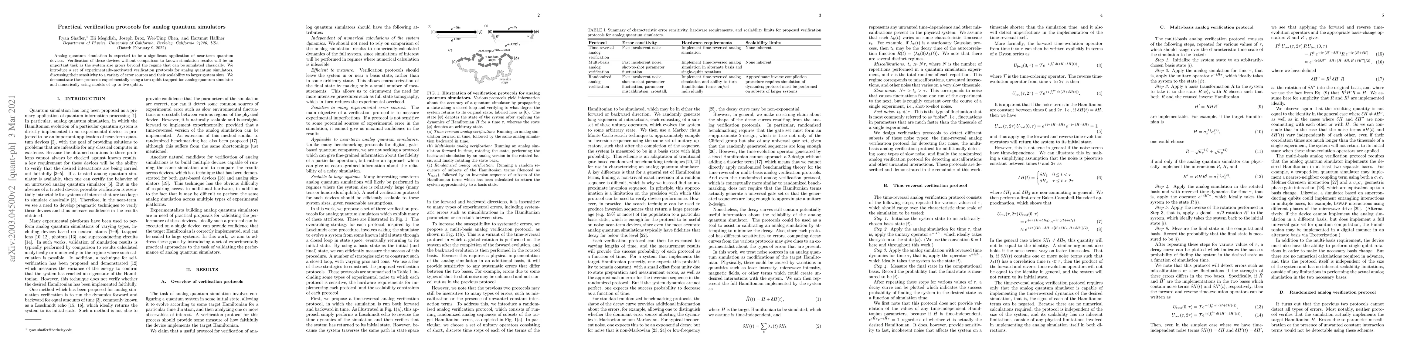 The paper introduces verification protocols for analog quantum simulators, focusing on their scalability and sensitivity to errors, and demonstrates them experimentally with a two-qubit trapped-ion system and numerically for up to five qubits. The protocols aim to validate quantum devices without reliance on classical simulations.