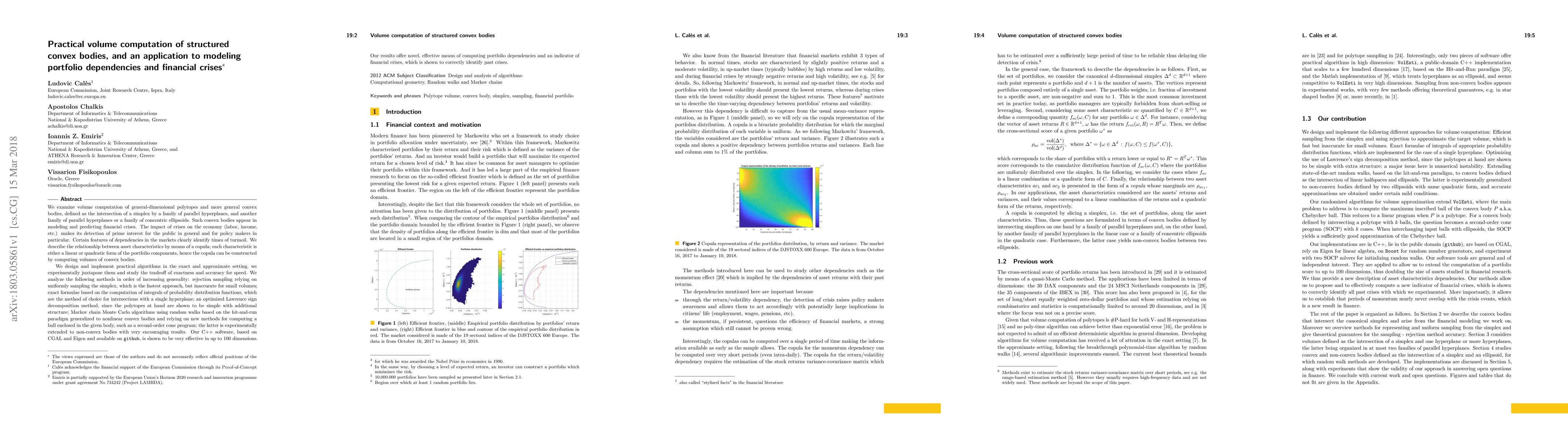 We examine volume computation of general-dimensional polytopes and more general convex bodies, defined as the intersection of a simplex by a family of parallel hyperplanes, and another family of parallel hyperplanes or a family of concentric ellipsoids. Such convex bodies appear in modeling and predicting financial crises. The impact of crises on the economy (labor, income, etc.) makes its detection of prime interest. Certain features of dependencies in the markets clearly identify times of turmoil. We describe the relationship between asset characteristics by means of a copula; each characteristic is either a linear or quadratic form of the portfolio components, hence the copula can be constructed by computing volumes of convex bodies. We design and implement practical algorithms in the exact and approximate setting, we experimentally juxtapose them and study the tradeoff of exactness and accuracy for speed. We analyze the following methods in order of increasing generality: rejection sampling relying on uniformly sampling the simplex, which is the fastest approach, but inaccurate for small volumes; exact formulae based on the computation of integrals of probability distribution functions; an optimized Lawrence sign decomposition method, since the polytopes at hand are shown to be simple; Markov chain Monte Carlo algorithms using random walks based on the hit-and-run paradigm generalized to nonlinear convex bodies and relying on new methods for computing a ball enclosed; the latter is experimentally extended to non-convex bodies with very encouraging results. Our C++ software, based on CGAL and Eigen and available on github, is shown to be very effective in up to 100 dimensions. Our results offer novel, effective means of computing portfolio dependencies and an indicator of financial crises, which is shown to correctly identify past crises.