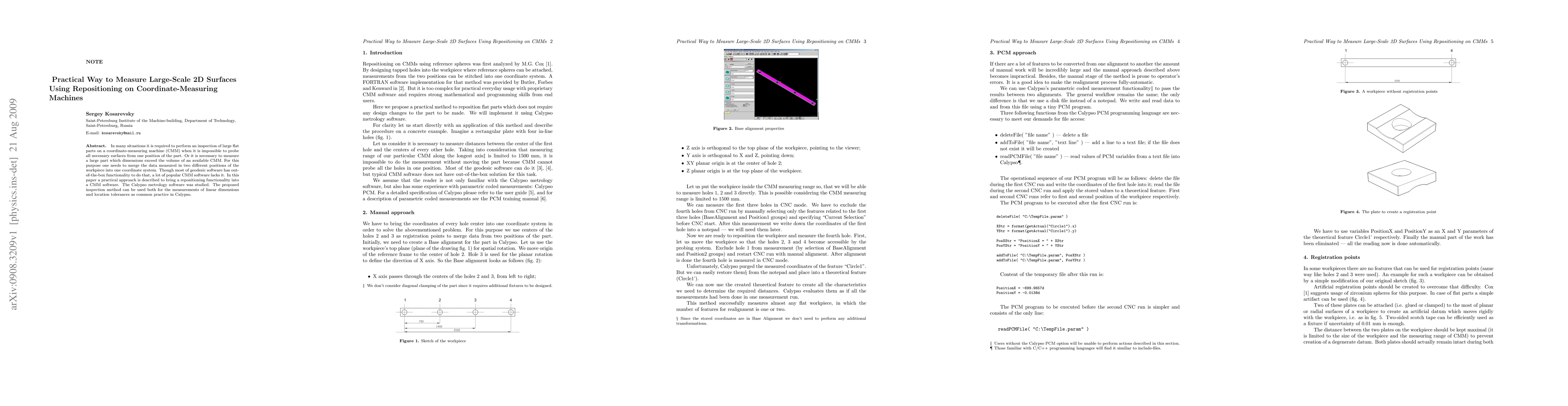 In many situations it is required to perform an inspection of large at parts on a coordinate-measuring machine (CMM) when it is impossible to probe all necessary surfaces from one position of the part. Or it is necessary to measure a large part which dimensions exceed the volume of an available CMM. For this purpose one needs to merge the data measured in two different positions of the workpiece into one coordinate system. Though most of geodesic software has out-of-the-box functionality to do that, a lot of popular CMM software lacks it. In this paper a practical approach is described to bring a repositioning functionality into a CMM software. The Calypso metrology software was studied. The proposed inspection method can be used both for the measurements of linear dimensions and location tolerances as common practice in Calypso.