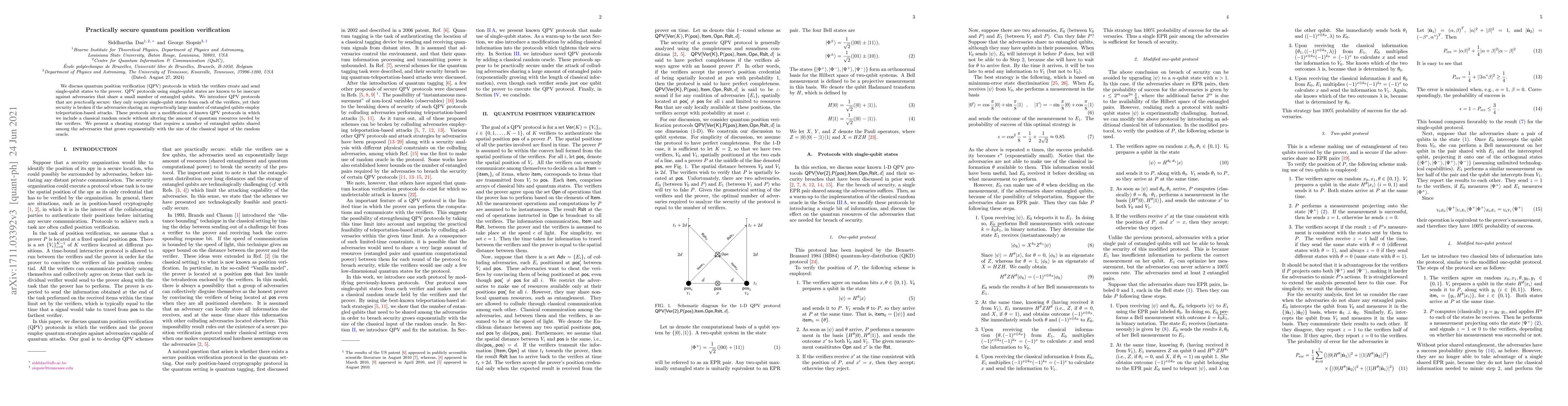 This paper introduces practically secure quantum position verification (QPV) protocols that utilize single-qubit states from verifiers, ensuring security unless adversaries share an impractically large number of entangled qubits. The security enhancement is achieved by incorporating a classical random oracle without increasing the quantum resources required.
