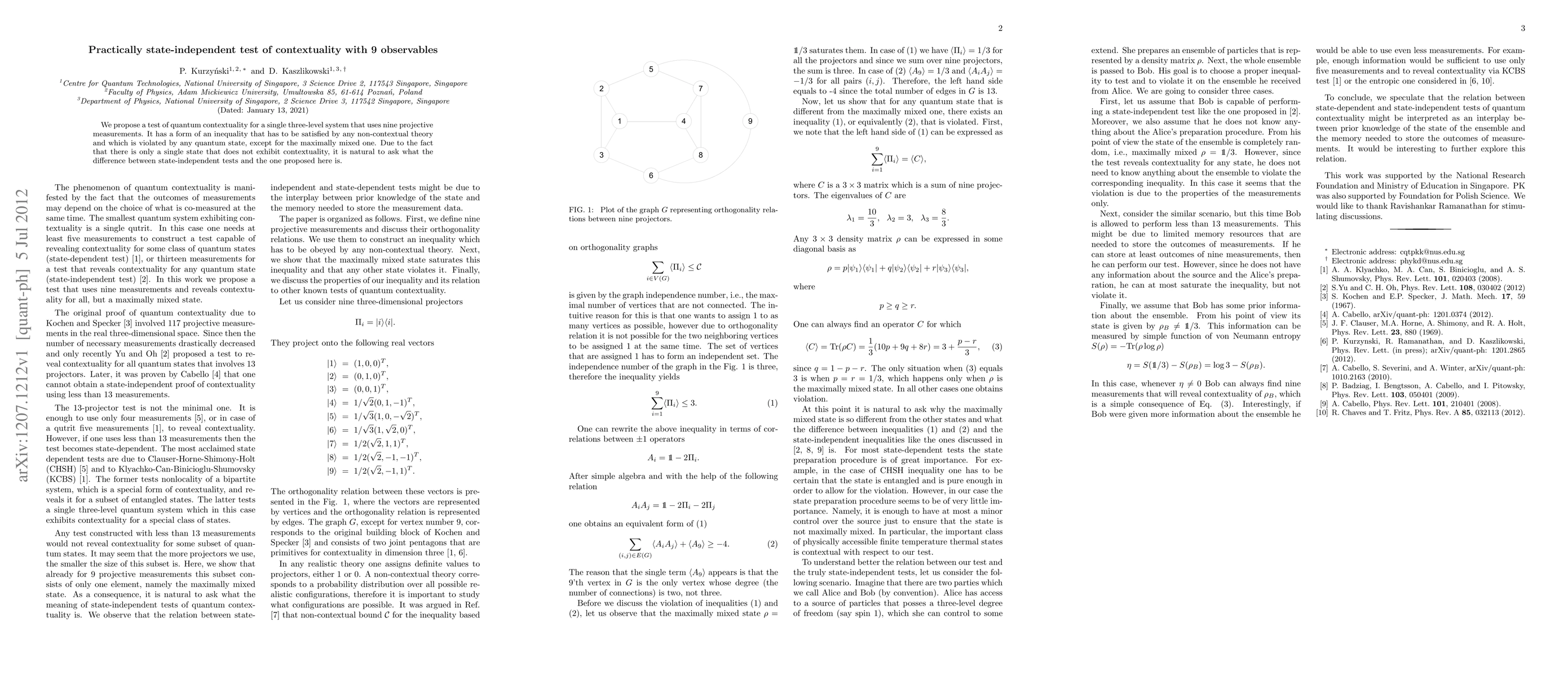 The paper presents an inequality based on nine projective measurements to test quantum contextuality in a single three-level system, distinguishing it from previous state-dependent and state-independent tests.